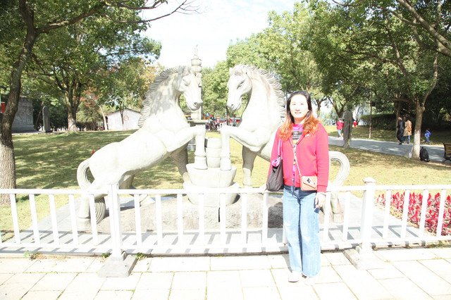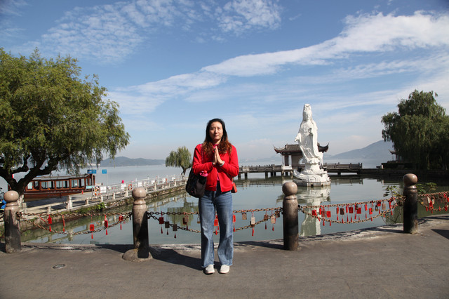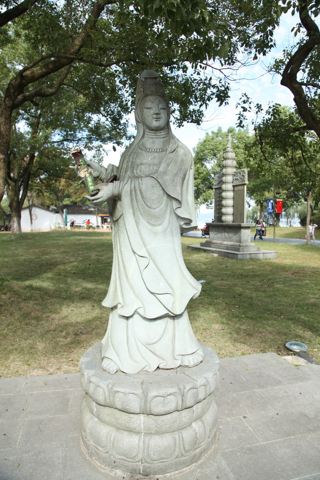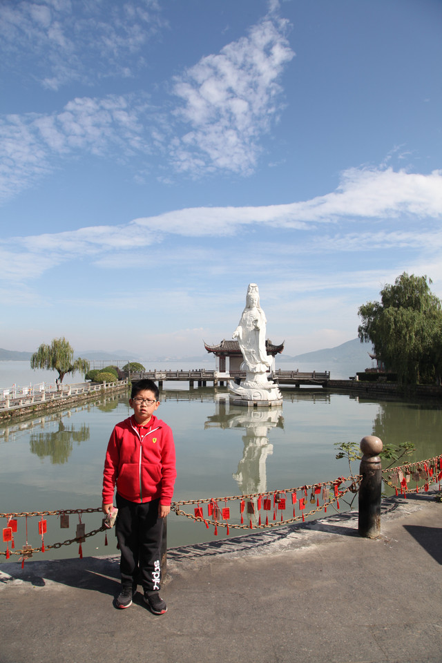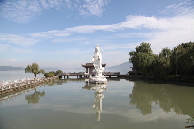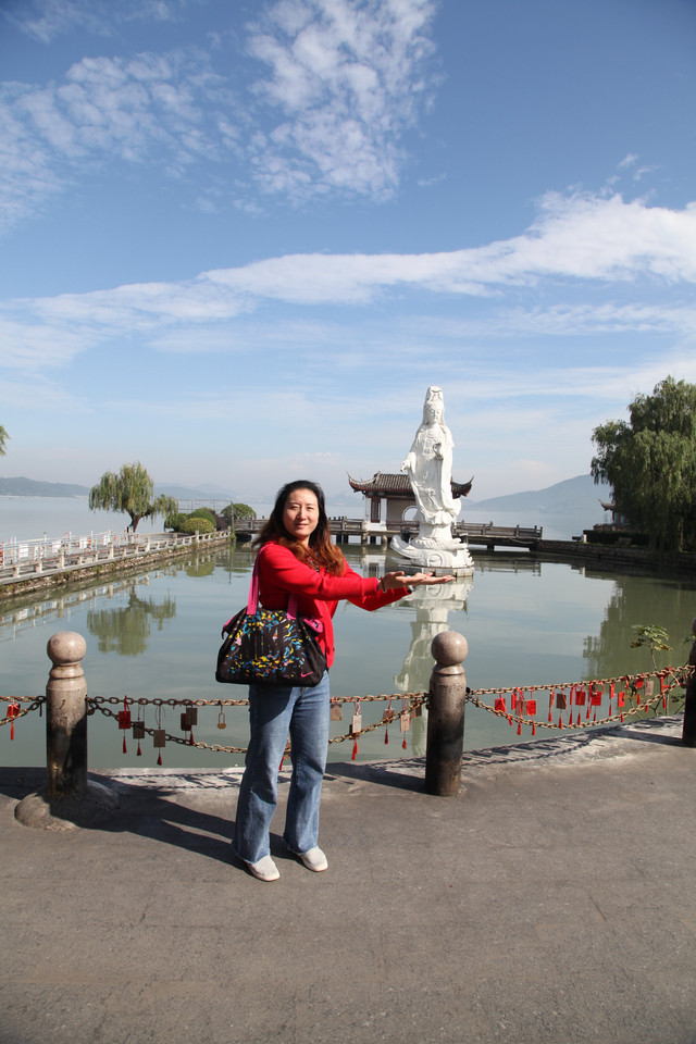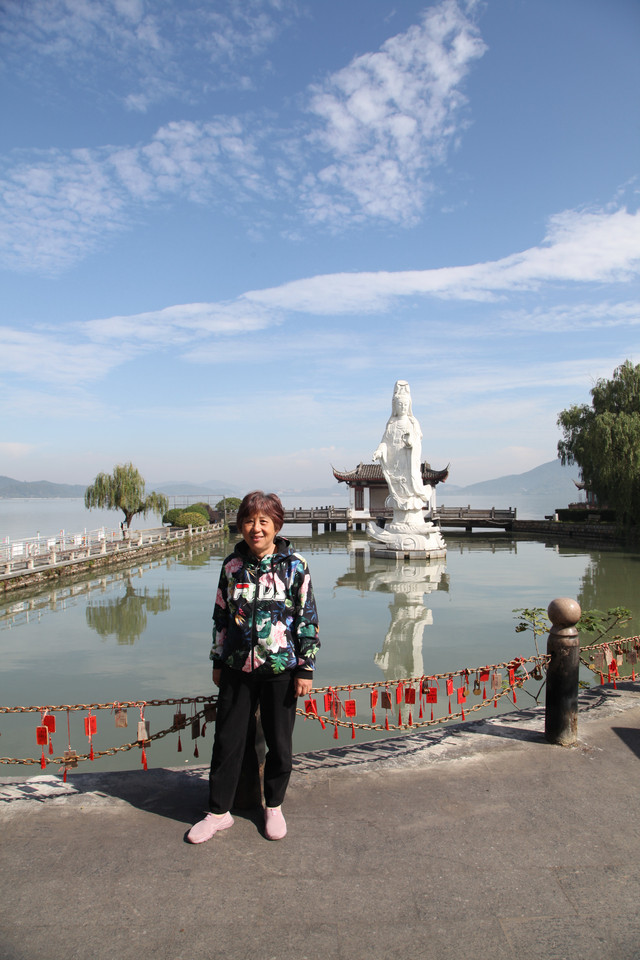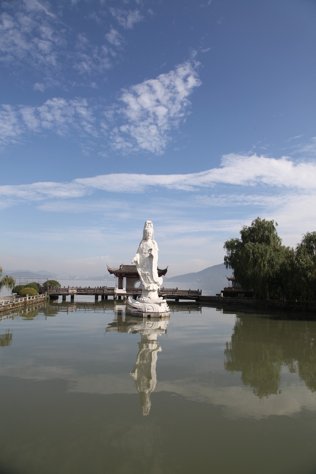 我们先来到小普陀景区东大门北侧的湖边,湖中塑有一尊高十米、通体雪白的水月观音宝像,右手持玉净瓶,以湖水为莲台,东钱湖整体为背景,高高站立在湖水微波中,以一双慈祥、柔和、关爱的慧眼,静静地注视着来往的芸芸众生。