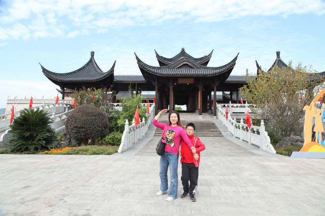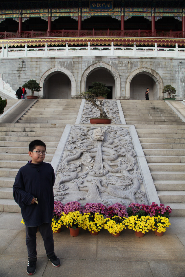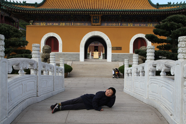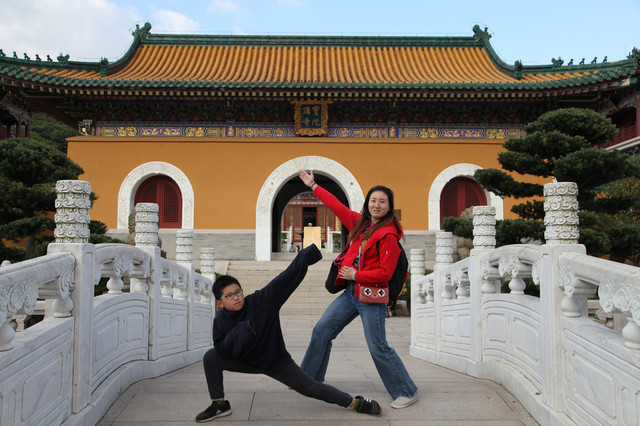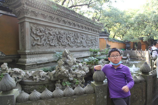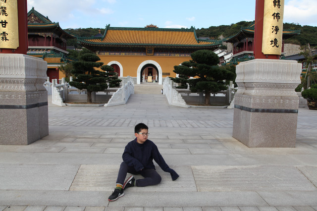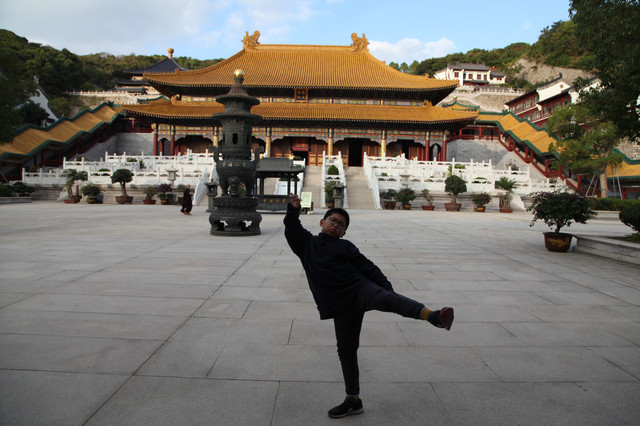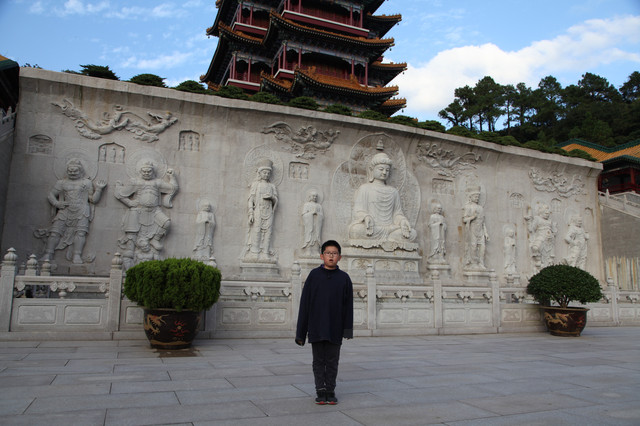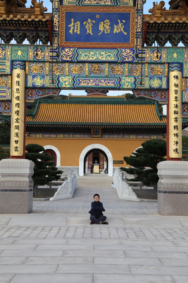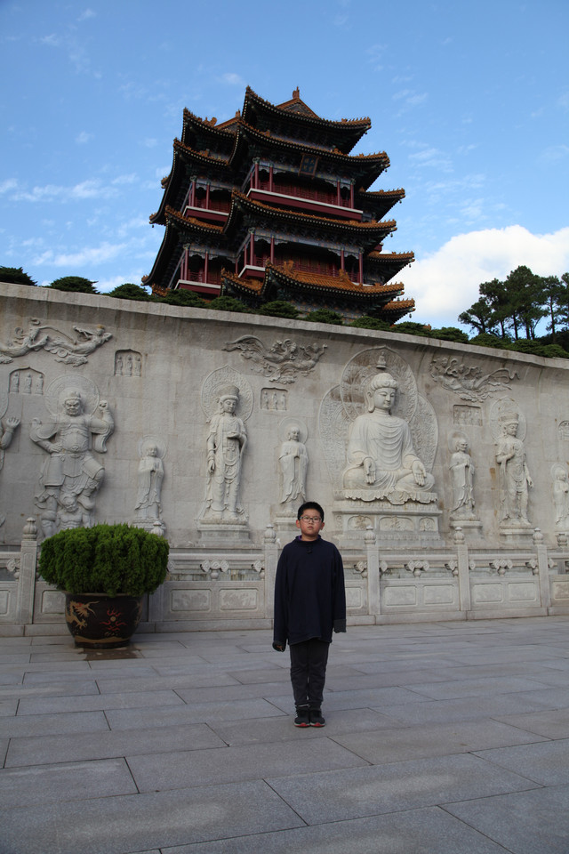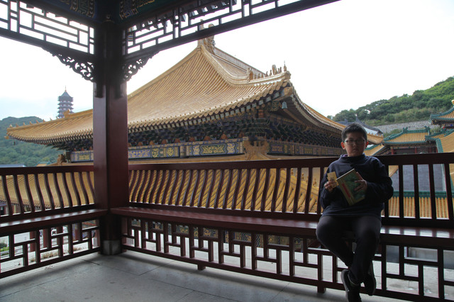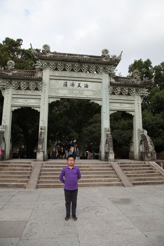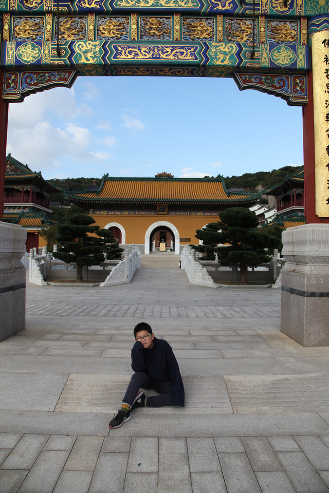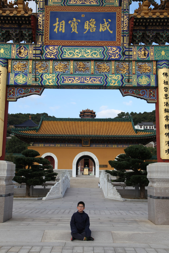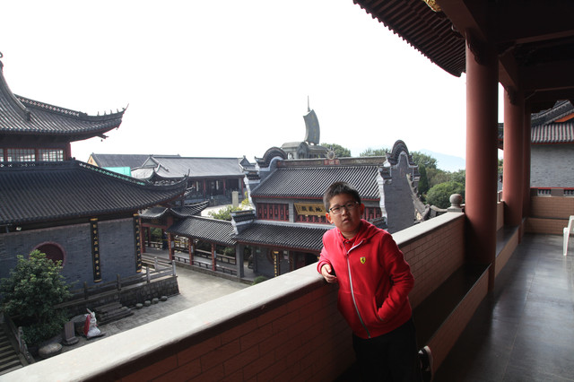 最后来到诸佛宝殿(原来叫三圣殿),上到二楼,供奉有观世音菩萨的三尊佛像。而且,这里还是眺望东钱湖欣赏湖光山景的胜地。龙太子在二层,和我们玩起了找人的小游戏,少年的灵气和睿智,展现无遗。