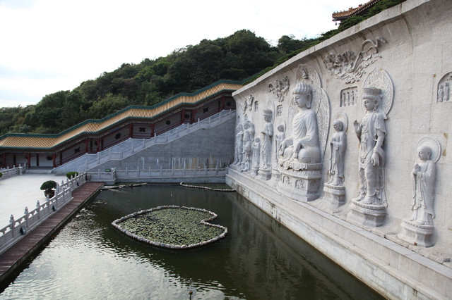 霞屿寺山门前,立有各种蕴含佛教哲理的佛物造像,南侧有石龟(寓意延年益寿)、石兔(寓意玉兔呈祥),北侧有两匹石马(寓意马到成功),以及手增元宝的菩萨(寓意富贵福禧),我们在霞屿寺山门前屹前,默默品读每一具佛家造像的寓意与真谛。