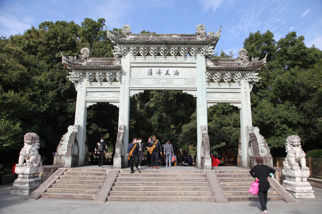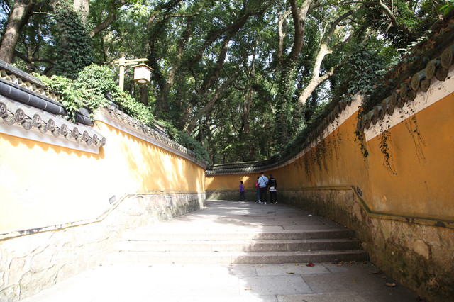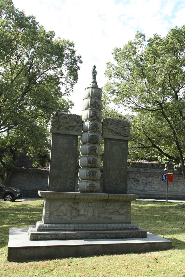 沿着石板路向前走,便来到了霞屿寺山门。山门牌匾上镌永着“霞屿禅寺”四个大字,正门上题有一副对联:“东钱湖光水月流星环佛地,补陀山色松青柳翠蔽禅天”。