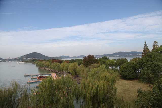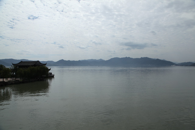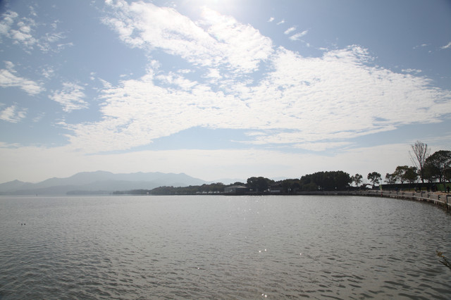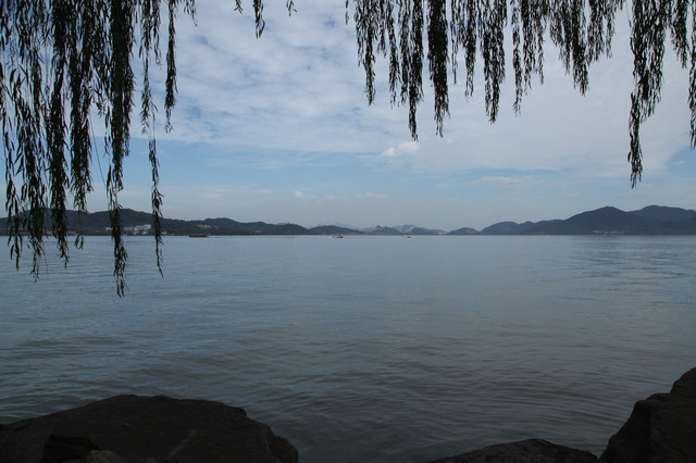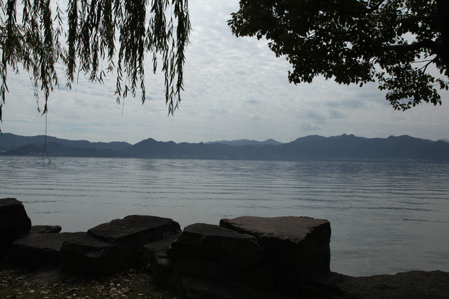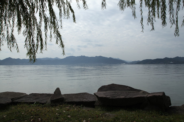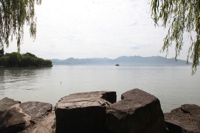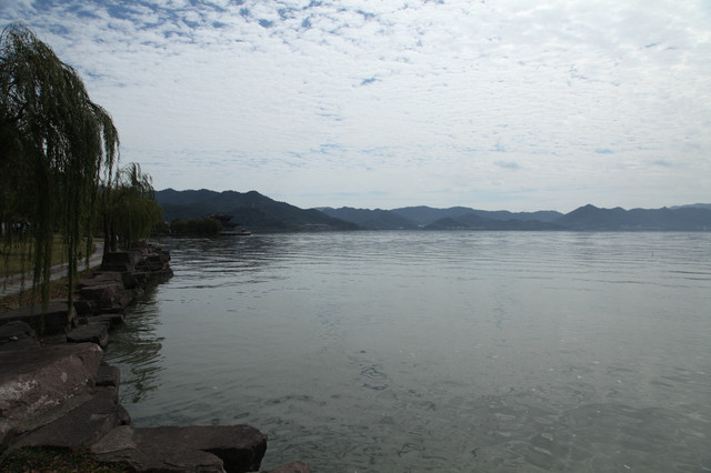 我们一边走,一边环顾这儿的湖光山色。只见长堤两岸,遍植杨柳,风拂湖面,摇曳丰姿。环湖的群山,巍峨延绵,雾岚缭绕,倒影如镜。