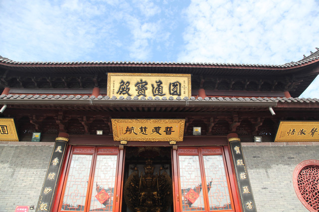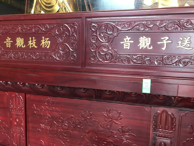 圆通宝殿,外观大气,建筑宏伟,飞檐翘壁,殿内正中为一尊面向南方的“千手观音”,栩栩如生,庄严殊胜。“千手观音”前方有一尊弥勒佛,其两侧为观音的童男童女,东为“吉祥”,西为“如意”。殿内东西墙璧两侧,各立有32尊观音应身法像,我们看到了“杨枝观音”和“送子观音”,位列其中。