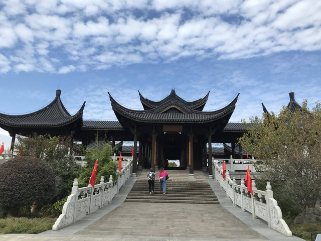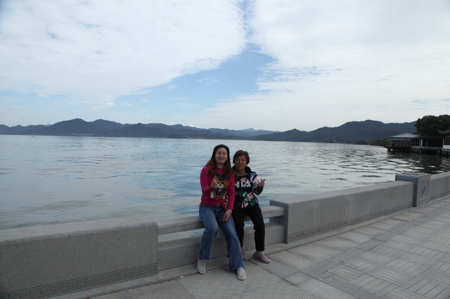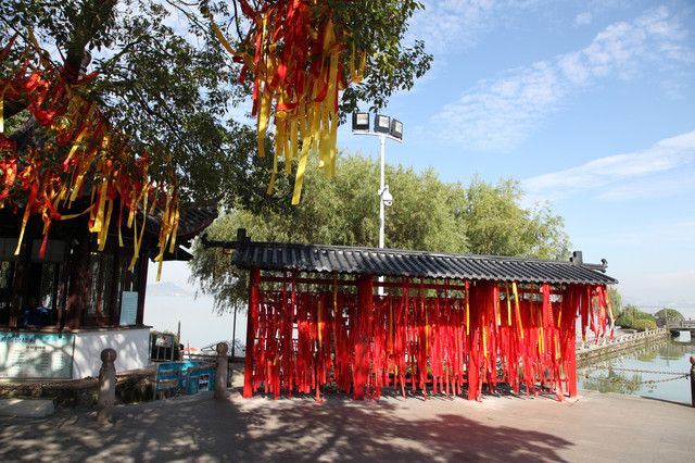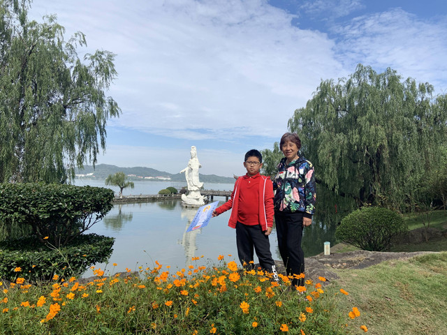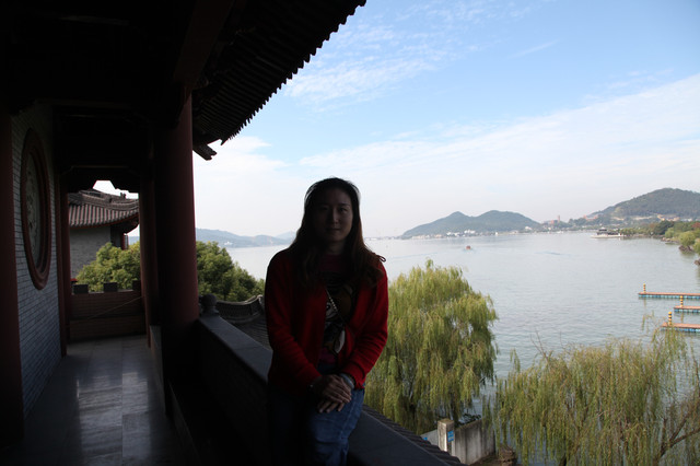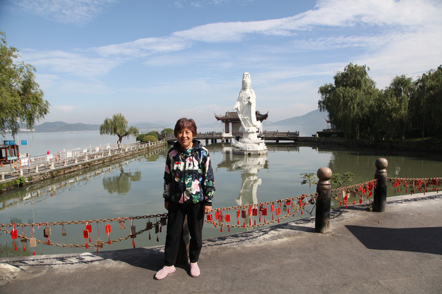 我们在小普陀景区(西门)处停好车,望着水波涟漪、湖水清澈、群山环抱的东钱湖,沿着垂柳飘依、绿树簇拥的长堤,漫步朝霞屿禅寺走来。