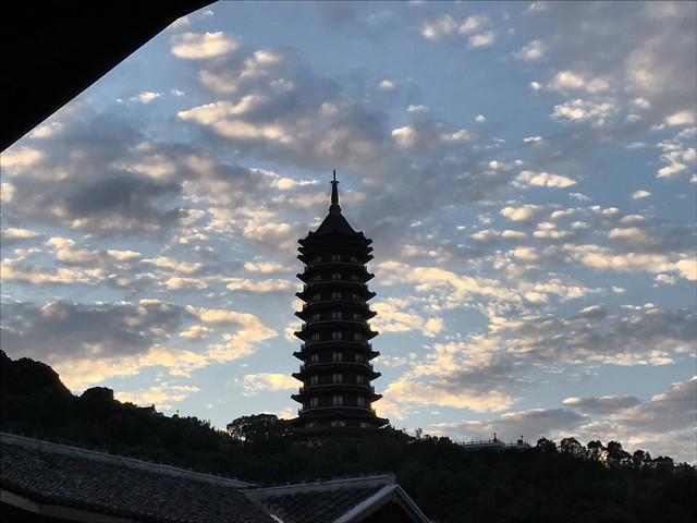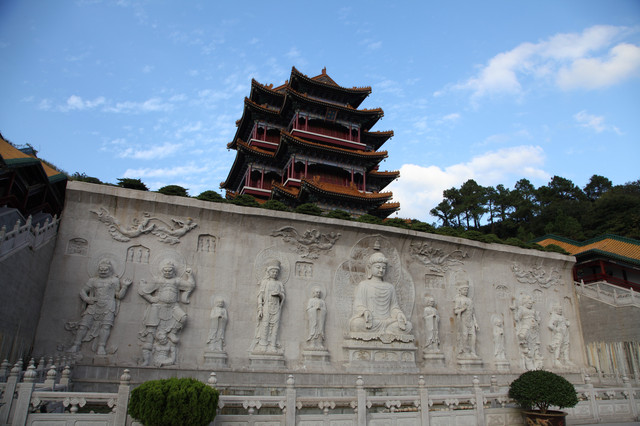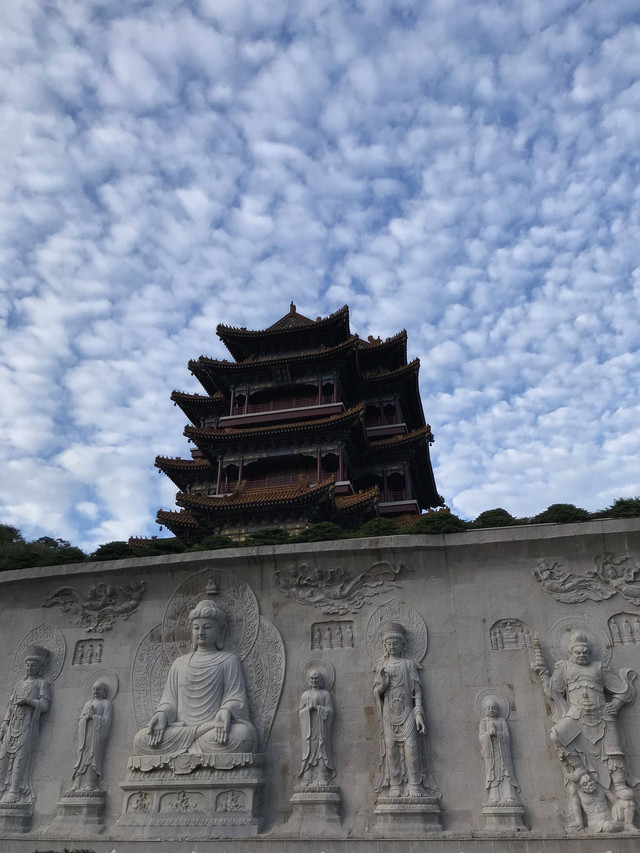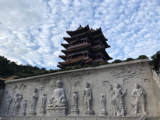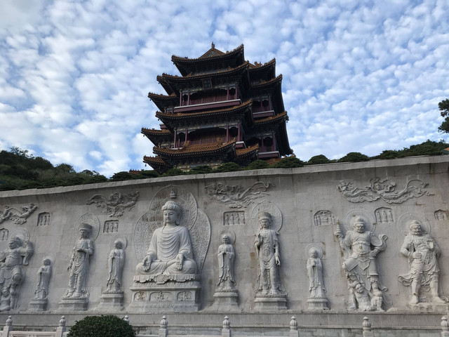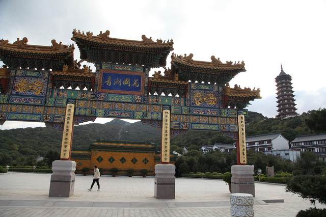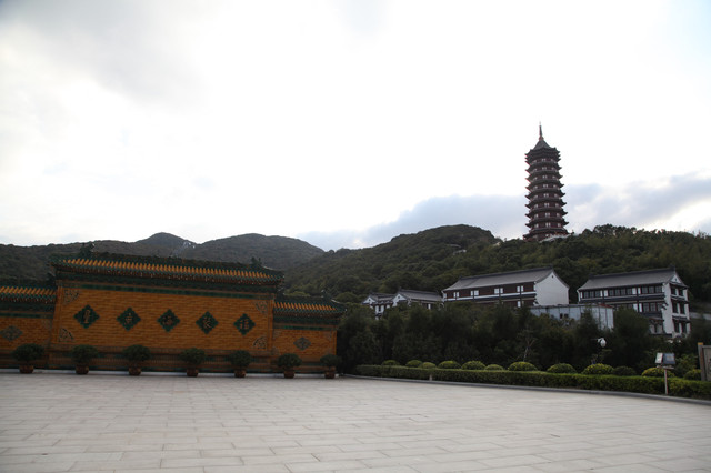 对面的山顶上,有一尊高大巍峨的普门万佛宝塔。宝塔采用清式八角重檐仿木结构建造,分九层十二檐,内供十种造型各异观音宝像一万尊。一层供毗卢观音1547尊:夹层供水月观音1176尊:二层供自在观音1176尊:三层供圆光观音1127尊:四层供骑龙观音1127尊:五层供净瓶观音973尊:六层供听潮观音805尊;七层供合掌观音805尊;八层供岩户观音630尊;九层供如意观音625尊。九层之势,以符“至尊”之意,堪称“世纪精品,人间一绝”。