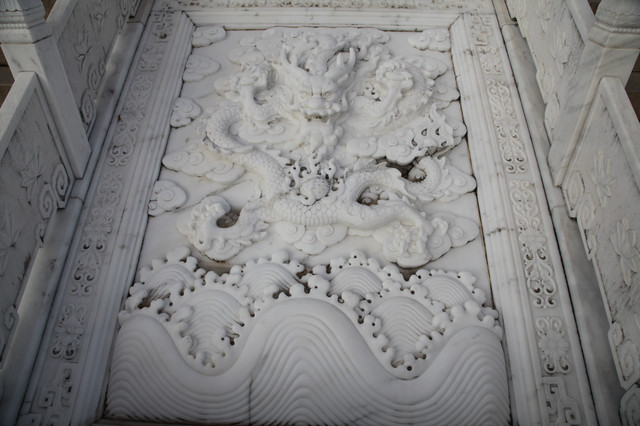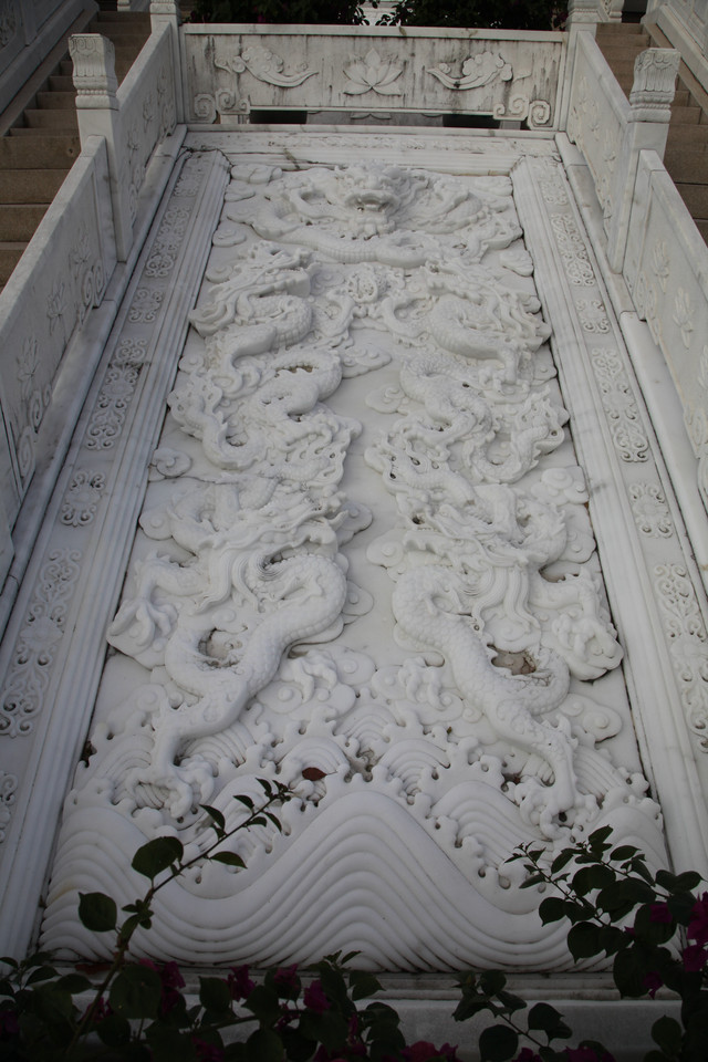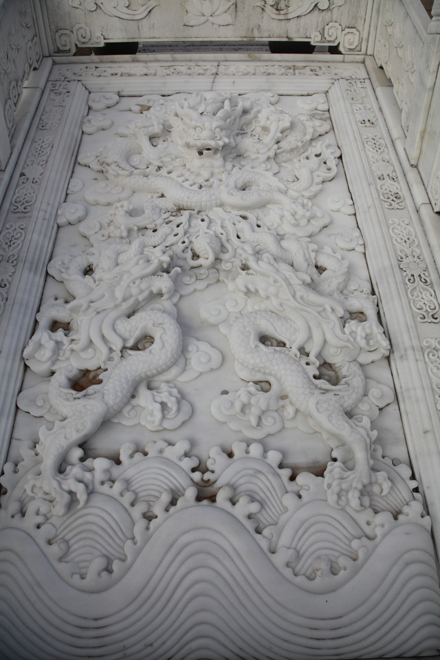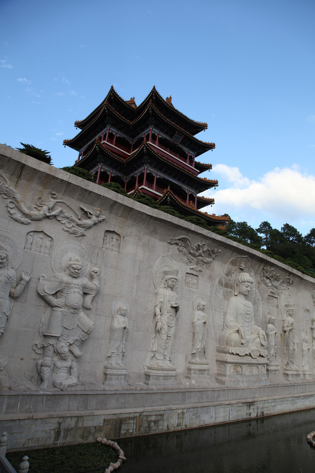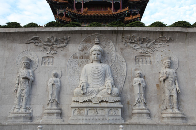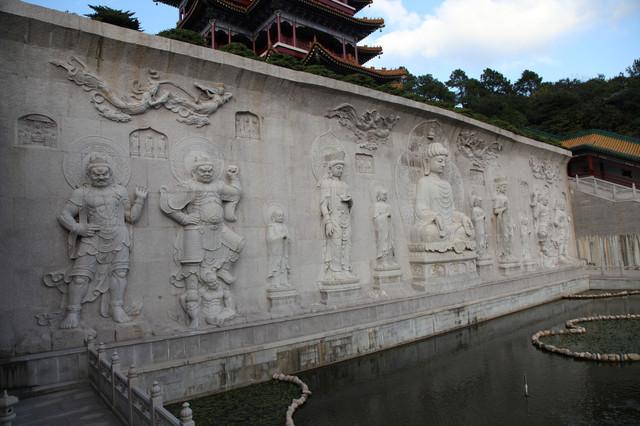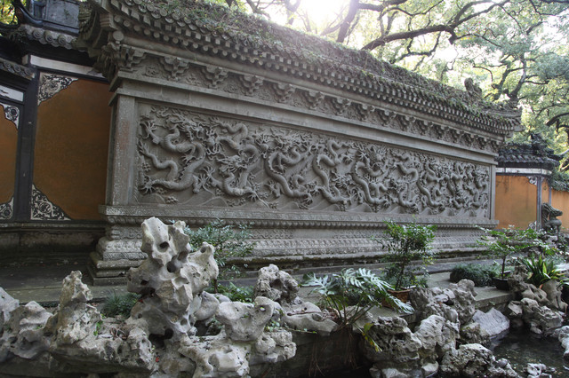 正对天王殿的照壁,居然是雕刻有九条龙的九龙壁,用青石精雕细凿拼接而成,不漏一丝缝隙,这可是真正的大国工匠的技术水准。