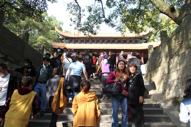 顺着东侧的长廊缓缓下山,来到佛顶山观光车站,等候去码头的中巴。排队的游客非常多,前面排了五十多人,车又少。
