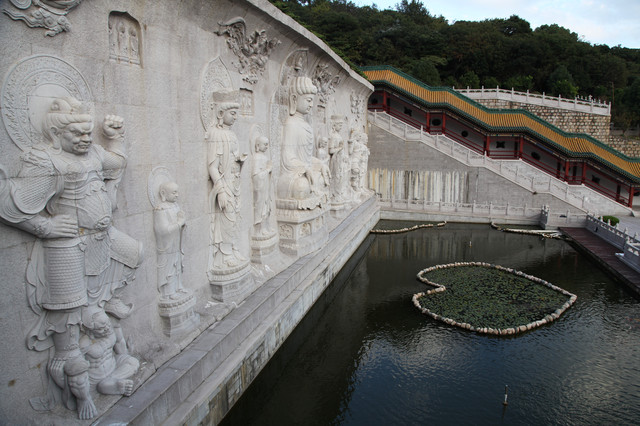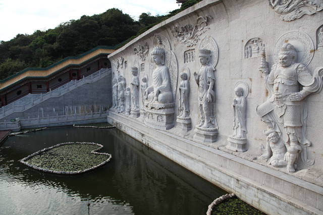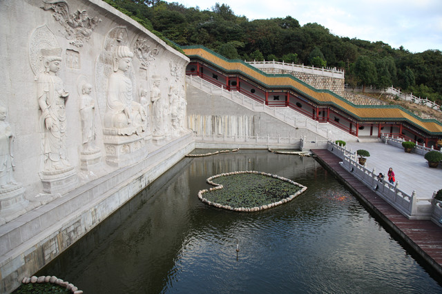 继续沿着陡峭的西侧长廊向上攀登,不一会就来到天池石窟。这是一片硕大的水景,水景中央有一条石链,围成一个大大的“心”字图案,以示敬佛崇佛虔诚之心。