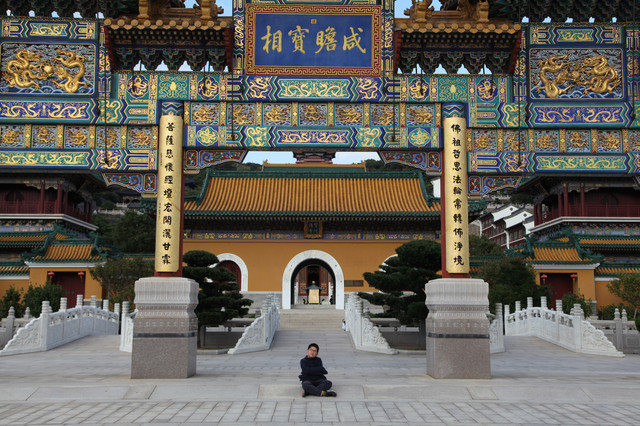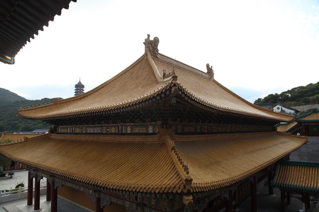 寺院主殿的九龙宝殿(供奉观音菩萨),是全国寺院建筑规格最高、等级至尊的佛殿,直接镶有九条金龙。最令人震撼的是,大殿顶部的“九龙藻井”。