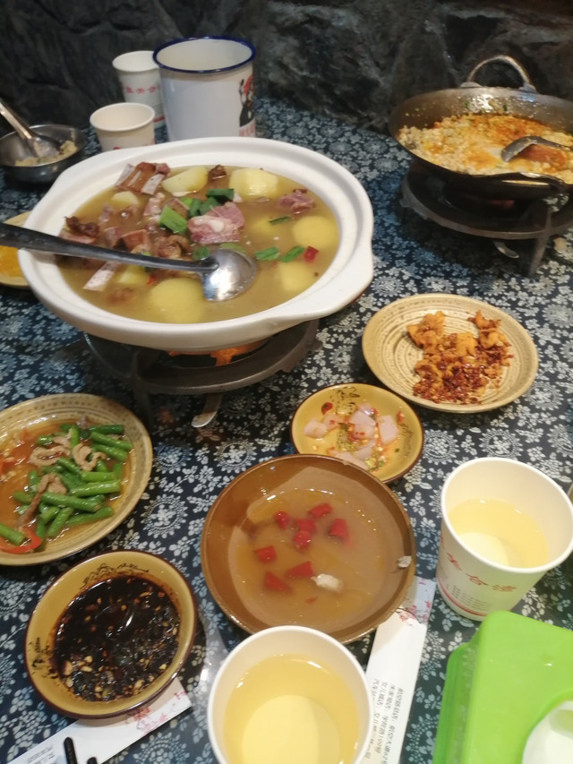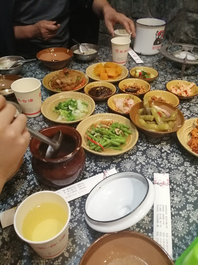吃这个当地饭菜是按人头收费的,一个人是55元。菜品就这么多,不够的话可以反复加菜,吃饱为止。刚开始有点懵圈,以为只要素菜可以反复加了,没敢加荤菜。荤菜也是可以反复加的,晕菜土家族主要是腊肉、腊排骨。我们这一餐就是5人220元,跟西安相比这样档次的饭菜还是比较贵。