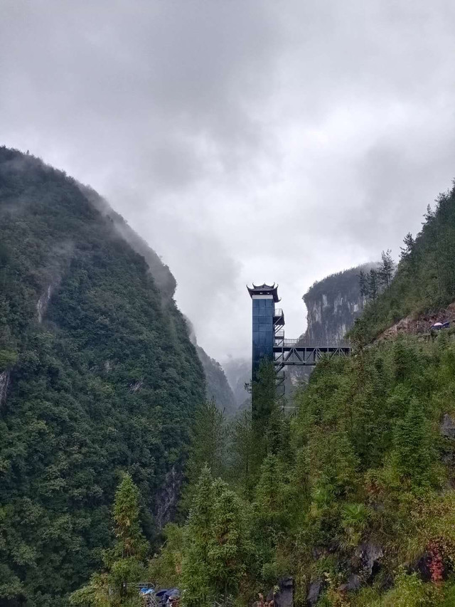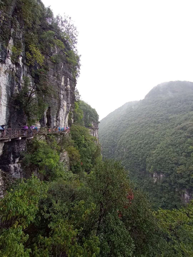10.3 雨天 早餐吃饱饱后开车前往恩施大峡谷,气候不太稳定,多雨潮湿,无论什么时候出门,建议随身携带雨具。酒店到峡谷一百多公里,到达游客中心换票乘坐大巴直接送到山脚下,也可乘坐索道。全程都是绝壁栈道,险而陡,整座山峰被仙气笼罩,看不清隔山的壮观景色,有点遗憾,因为是雨天。