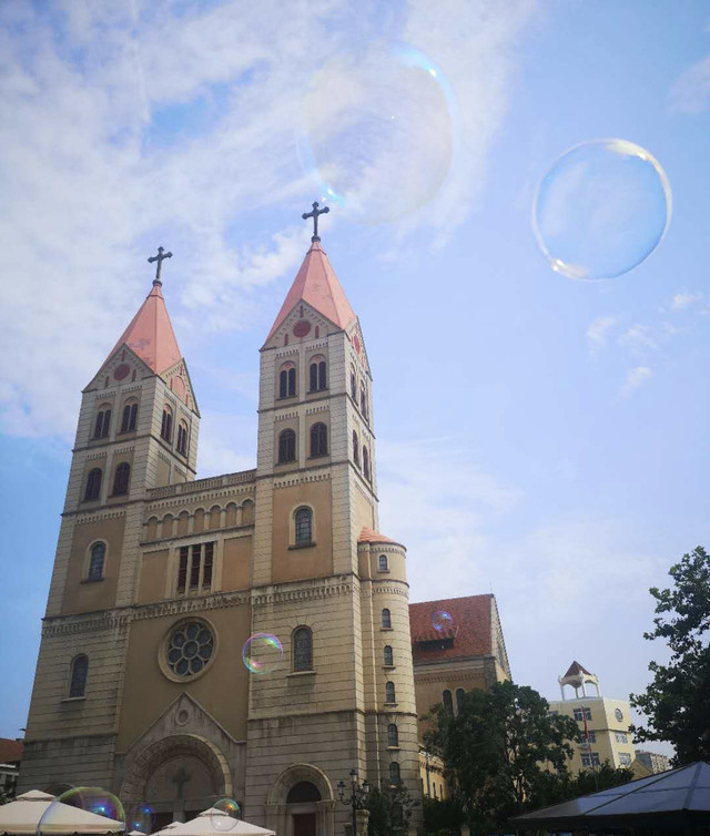 八大关—天主教堂:集合上车后,开车去天主教堂,导游经过路段就介绍说到了八大关,八大关也就是八条路,其实有十条,本地人习惯叫八大关了。。。在此对路介绍了一下,比如:八大关是最能体现青岛“红瓦绿树、碧海蓝天”特点的风景区,然而也就在车上撩开车窗帘瞅着。最后到达了天主教堂,下车后就开始拍照,说教堂不能进去,在外拍照留念。