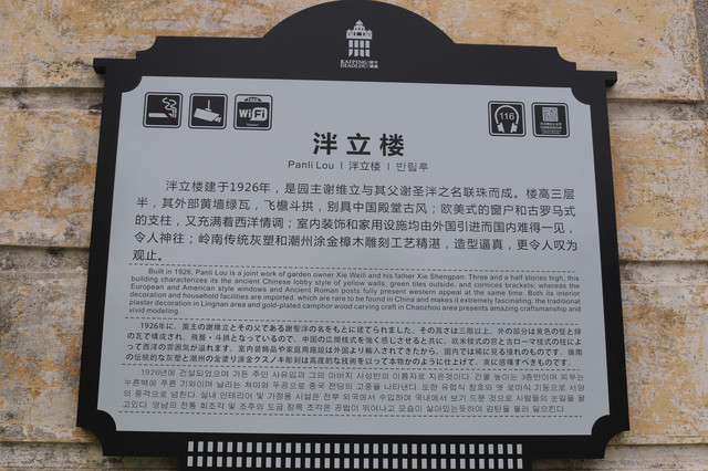 立园是旅美华侨谢维立先生历时十年建造的私家园林,于民国25年(1936年)建成。该园集传统园林、岭南水乡和西方建筑风格于一体。园内分大花园、小花园和别墅区三部分,彼此以人工河或围墙分隔,又用桥亭和回廊连成一体,园中有园,景中有景。别墅区有泮文、泮立等六幢别墅和碉楼一座,中西合壁,气势恢宏;室内装饰和摆设,丰富豪华典雅。据说,其中西合璧的独特建筑艺术风格在中国园林中独树一帜,足可与广东四大名园媲美