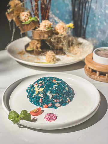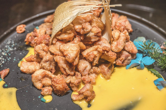 裹着牛油果和芥末的虾球就放在木台阶上,真的有种《绿野仙踪》的感觉,这外层口感香甜酥脆,虾球更是Q弹,还有股淡淡的芥末味.