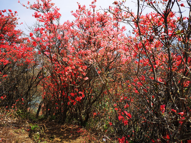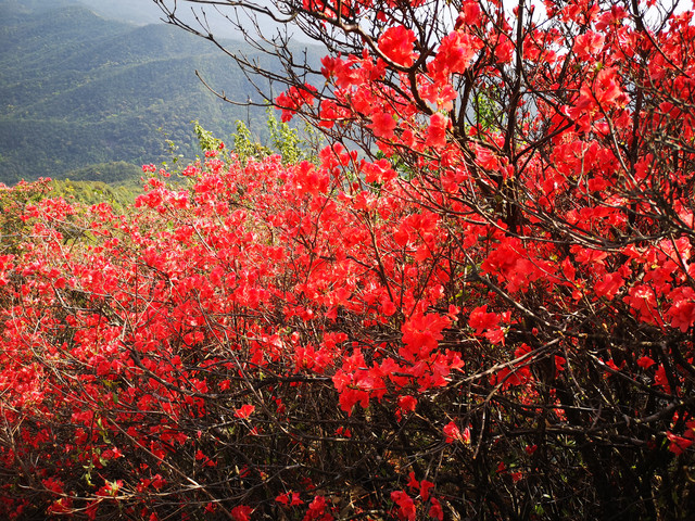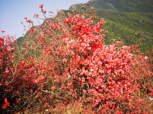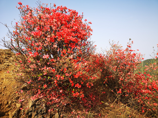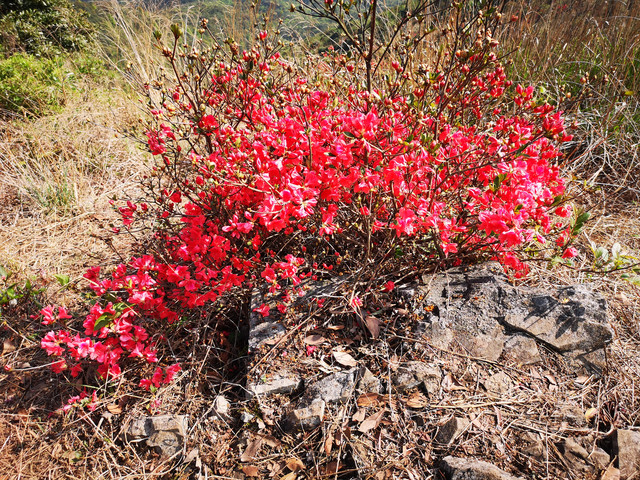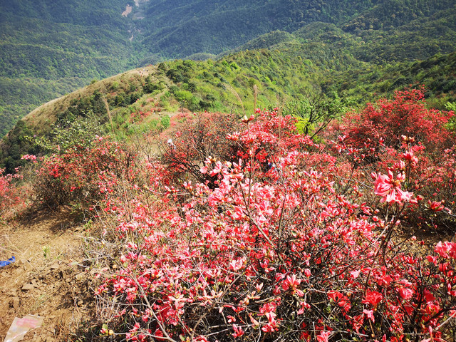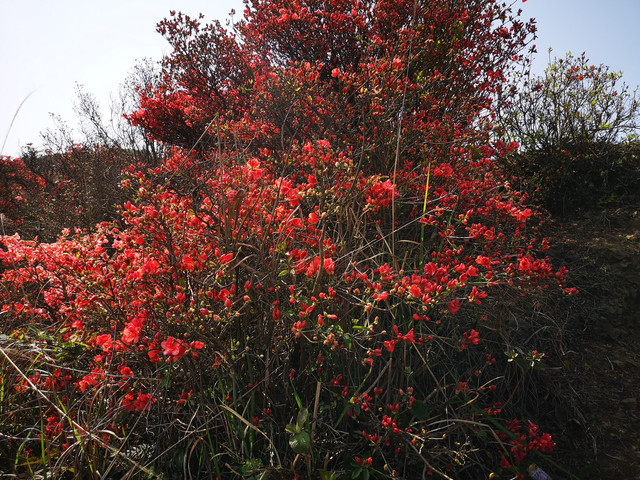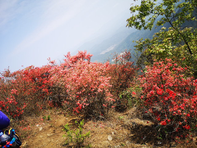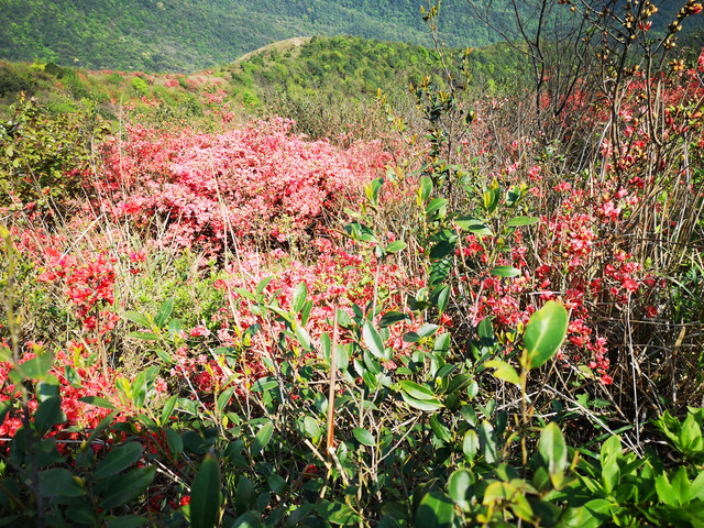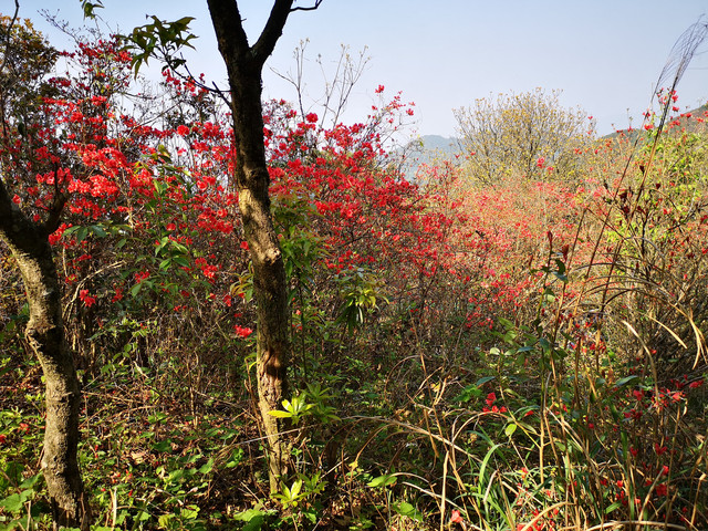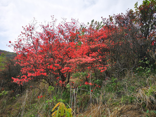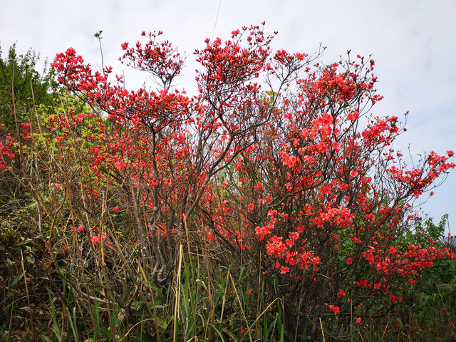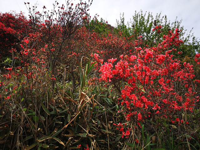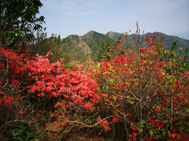 接近山顶的斜坡,开满了鲜红的杜鹃花。