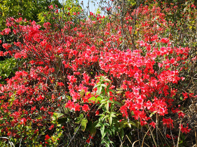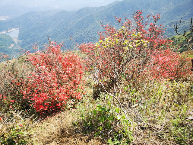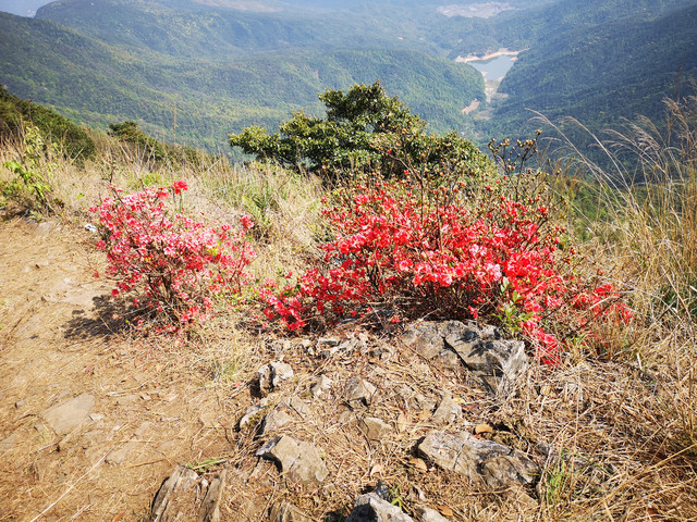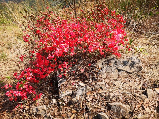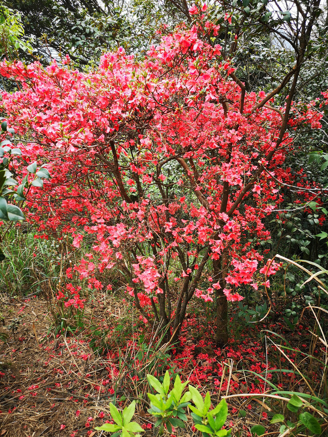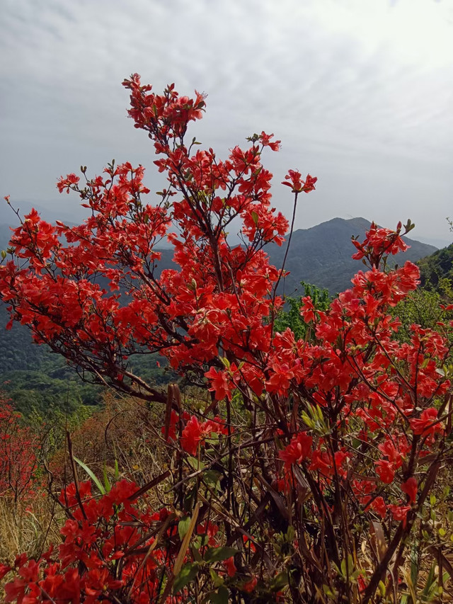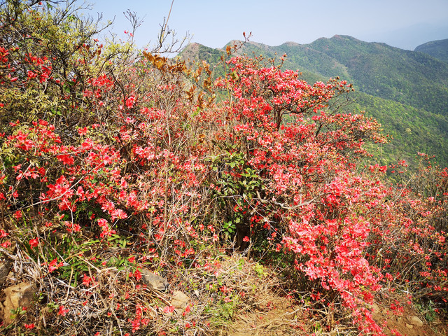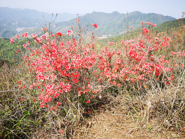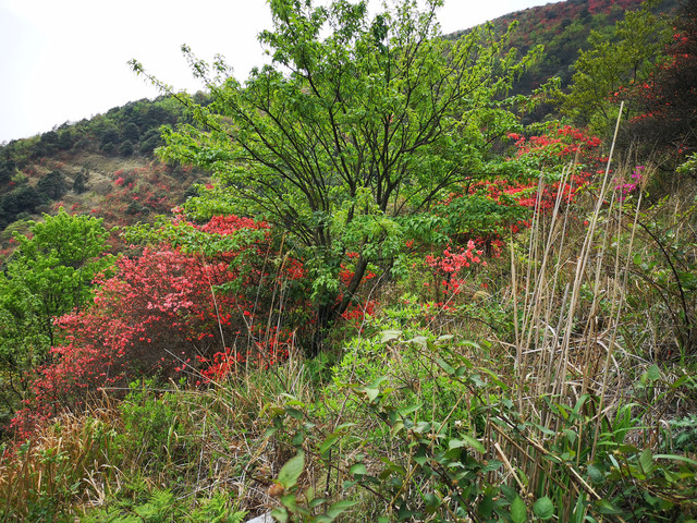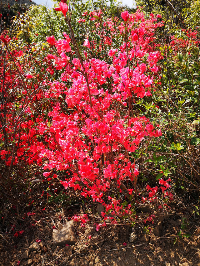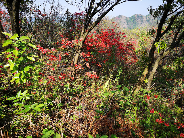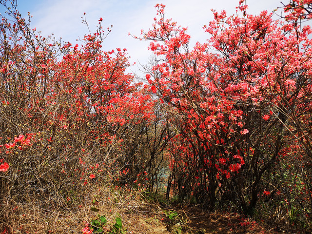 接近山顶的斜坡,开满了鲜红的杜鹃花。