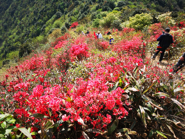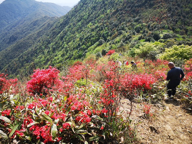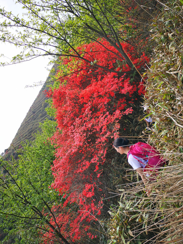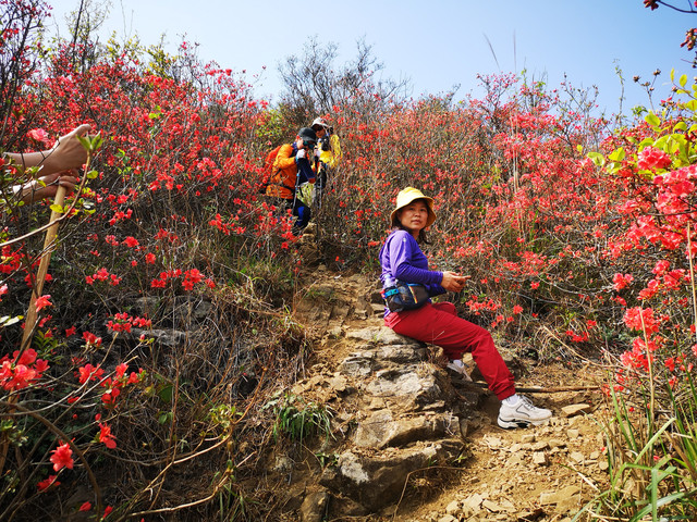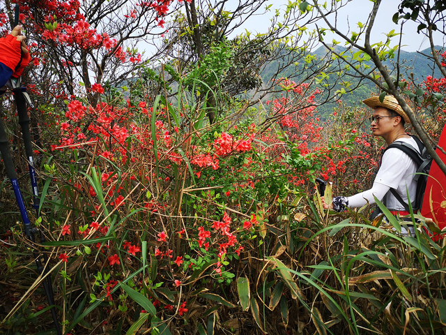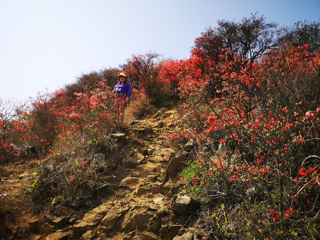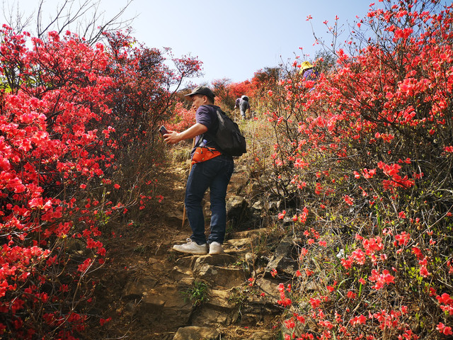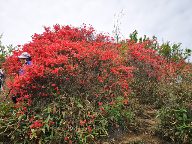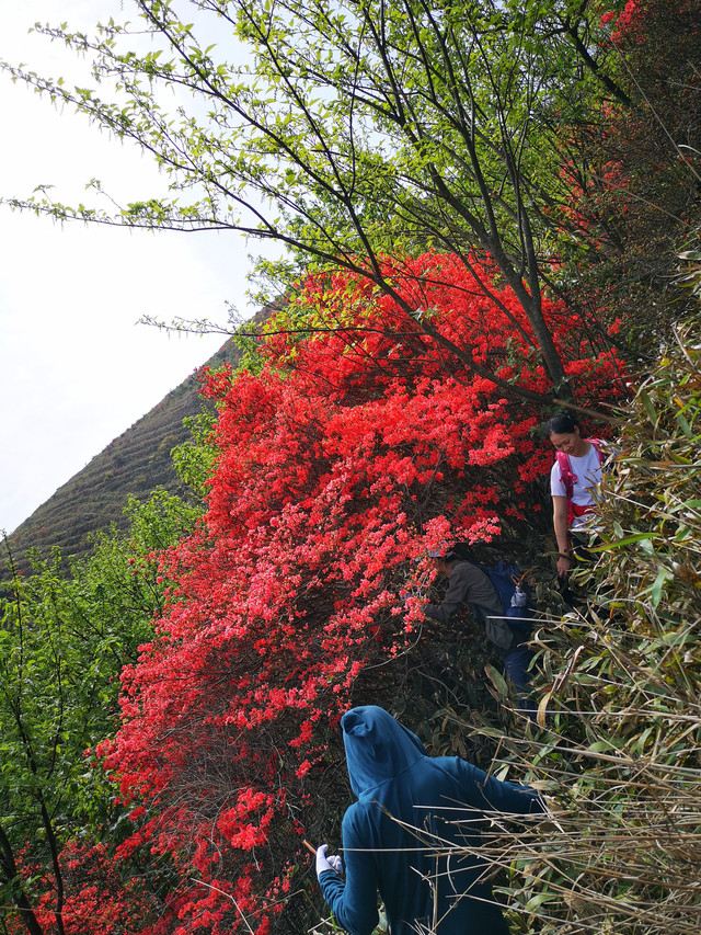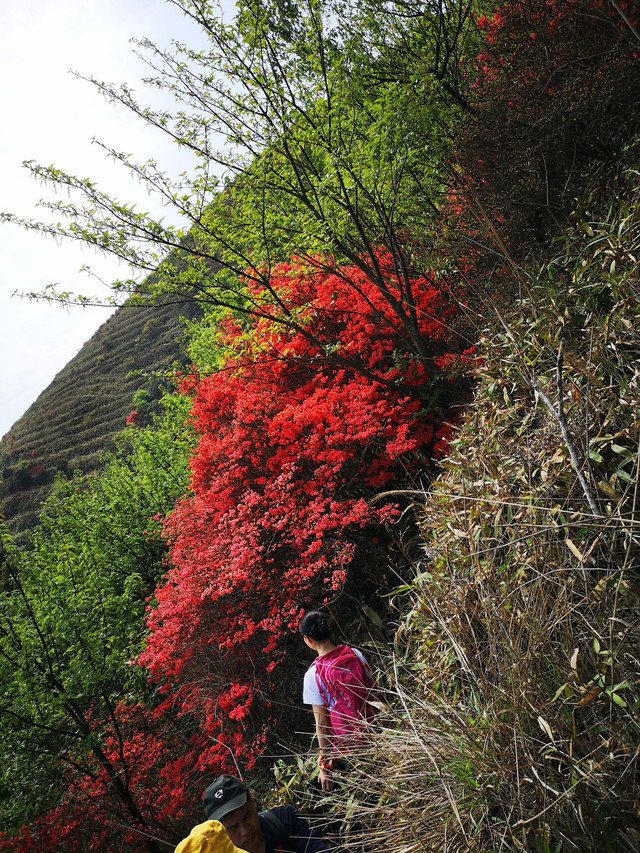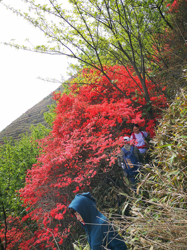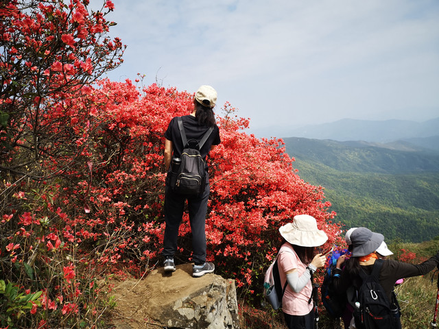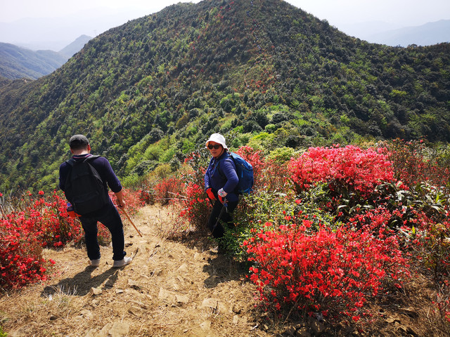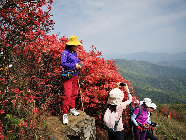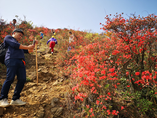 接近山顶处,满山的杜鹃花灿烂地开放了,移步换景,驴友们如蜜蜂般穿梭在鲜红的花丛中,寻找最佳机位出大片。