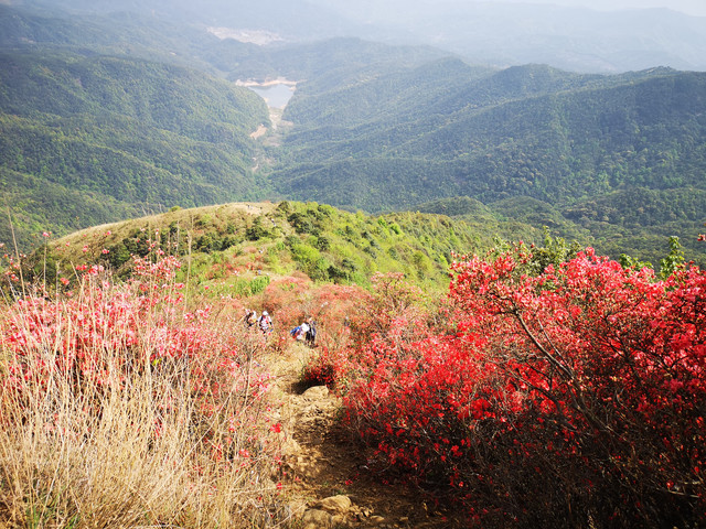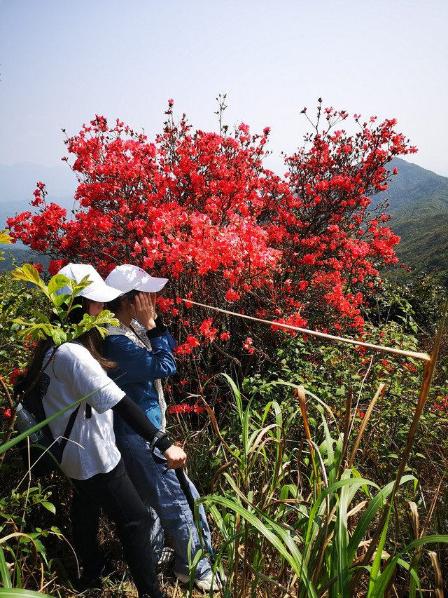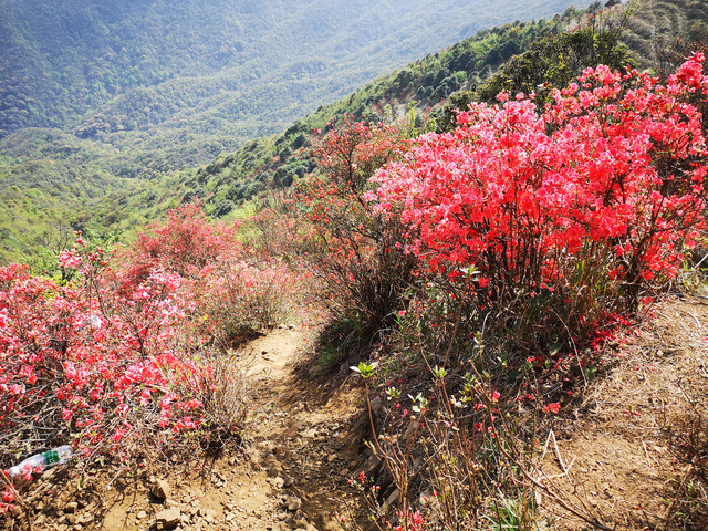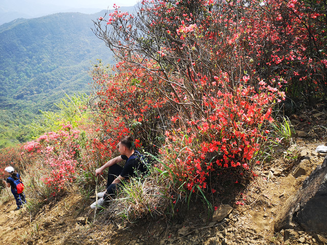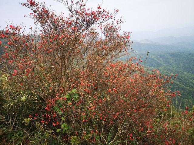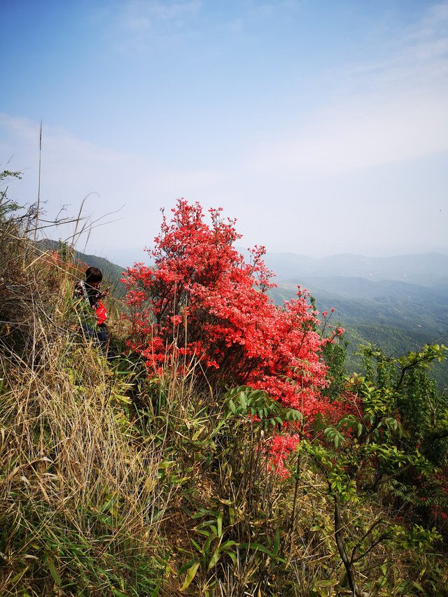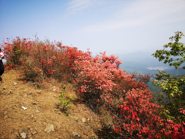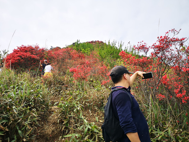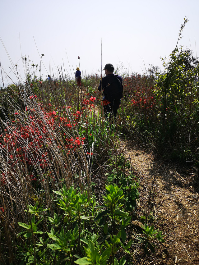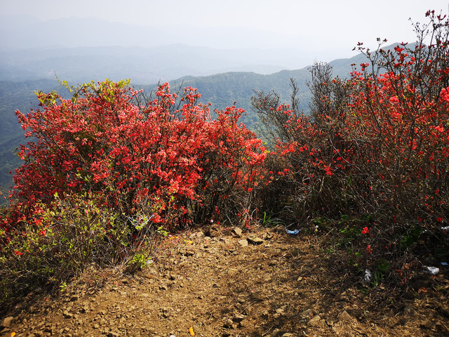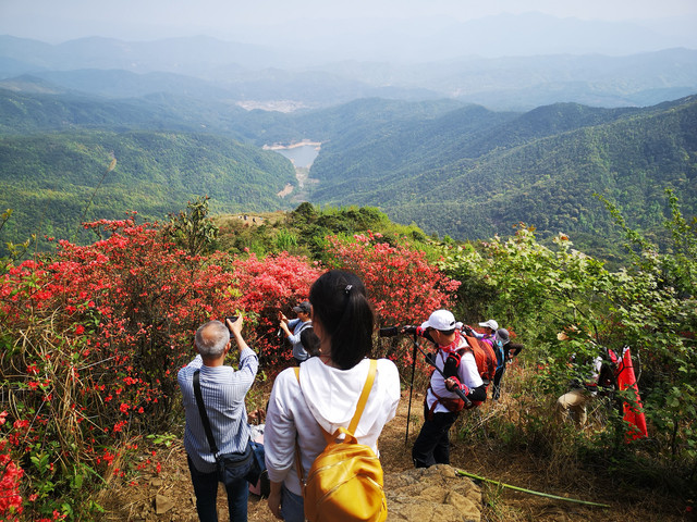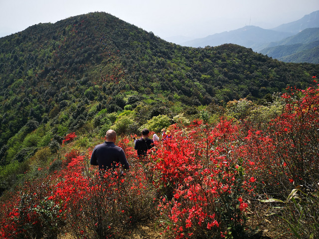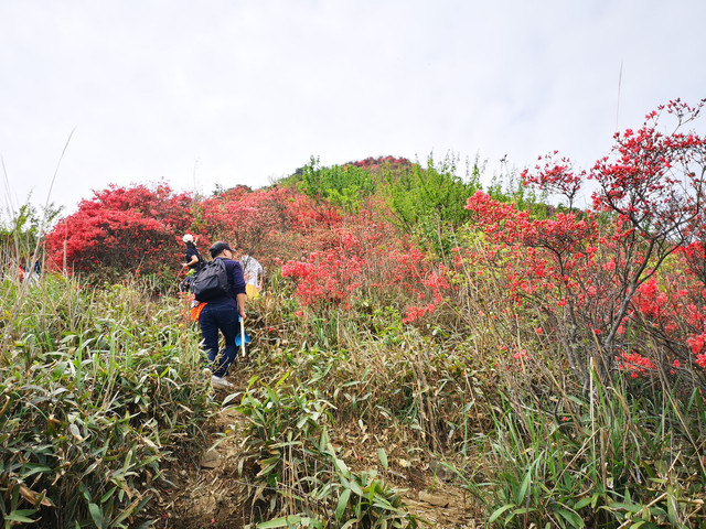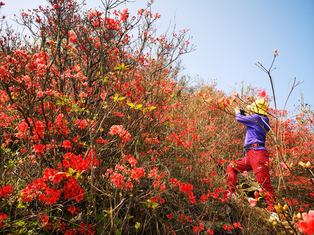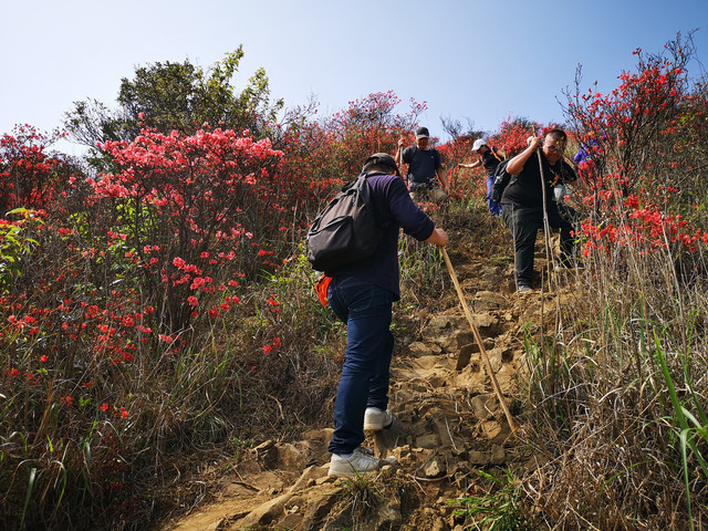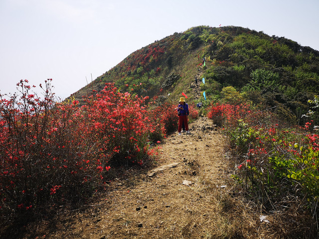 接近山顶处,满山的杜鹃花灿烂地开放了,移步换景,驴友们如蜜蜂般穿梭在鲜红的花丛中,寻找最佳机位出大片。
