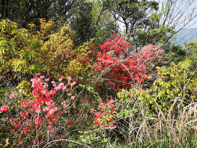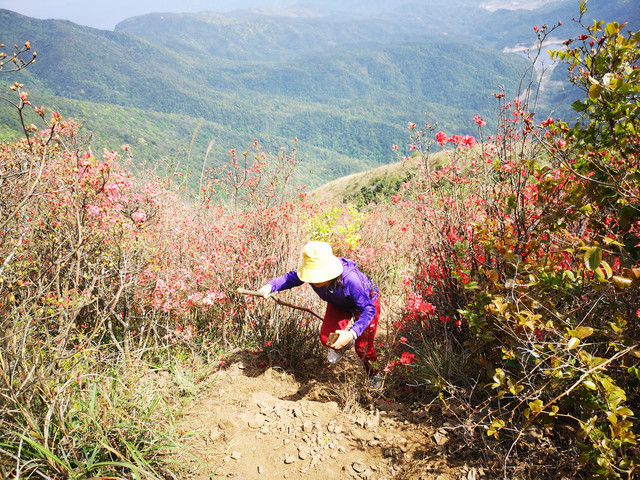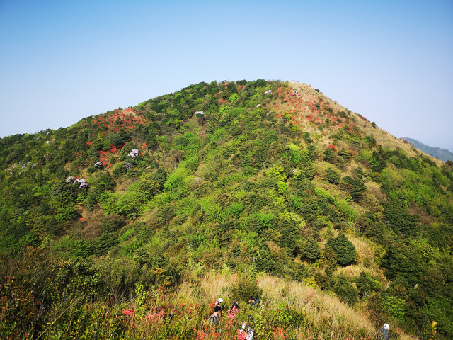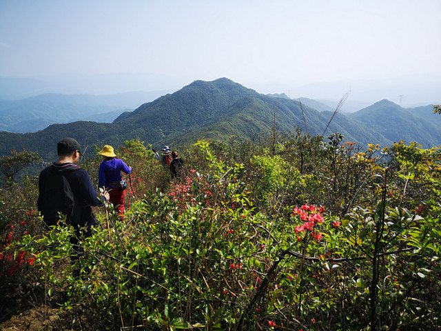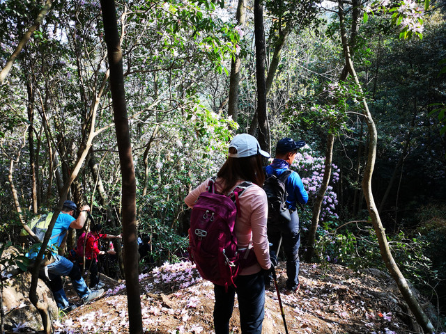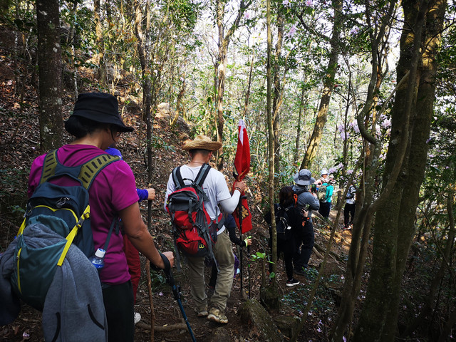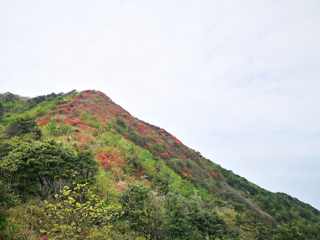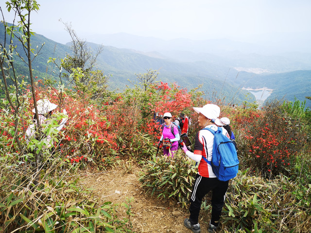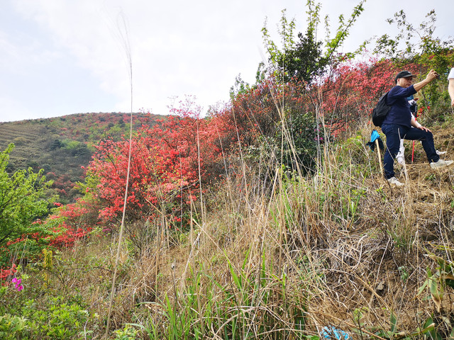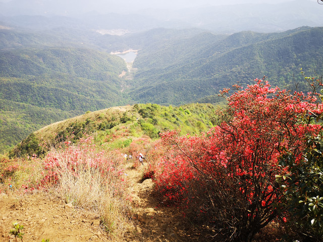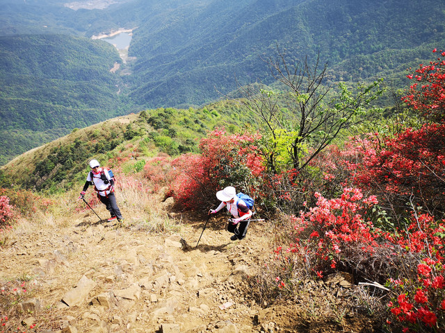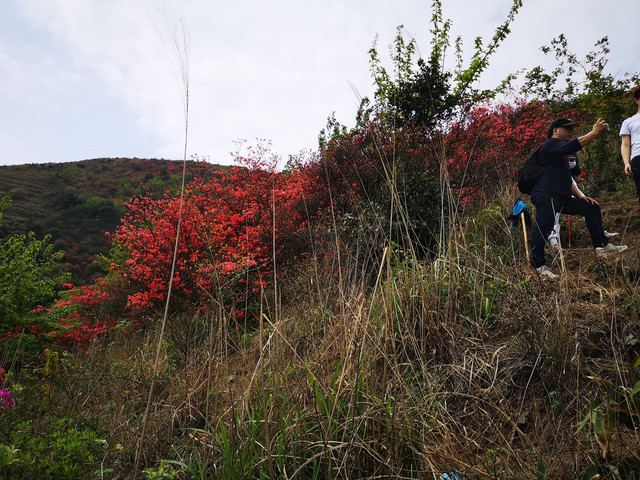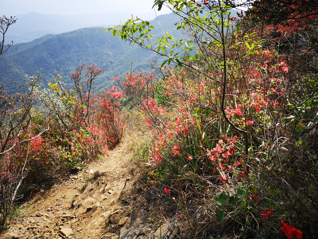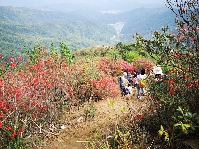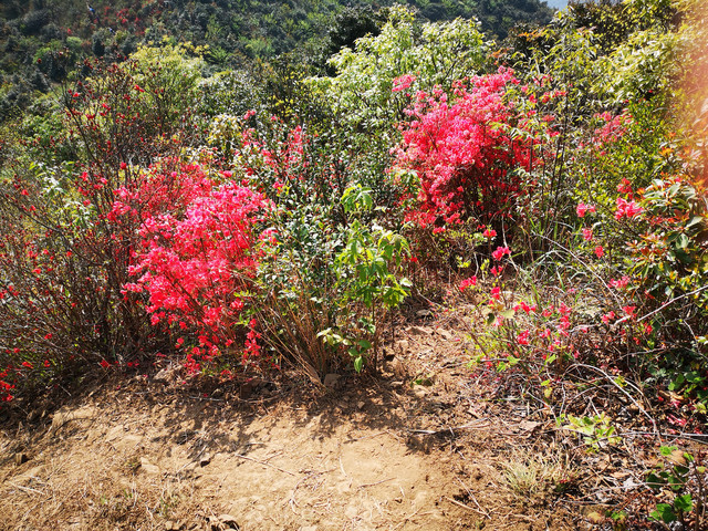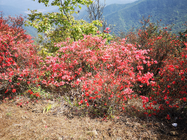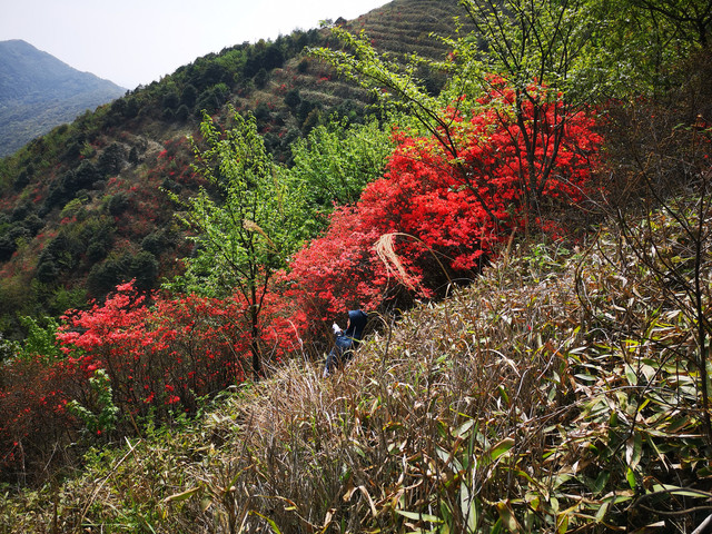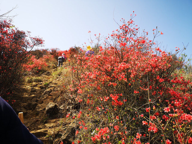 接近山顶处,满山的杜鹃花灿烂地开放了,移步换景,驴友们如蜜蜂般穿梭在鲜红的花丛中,寻找最佳机位出大片。