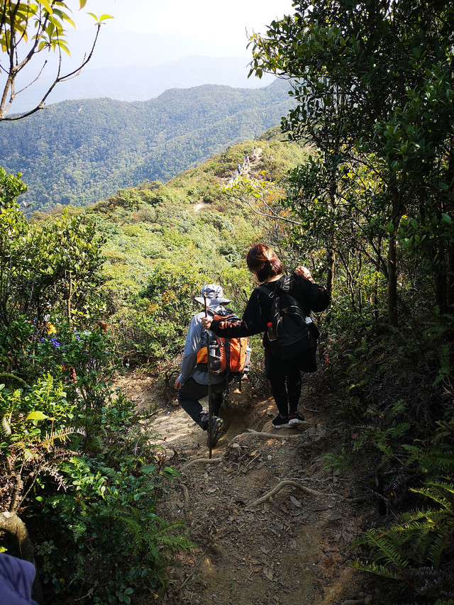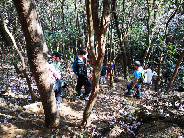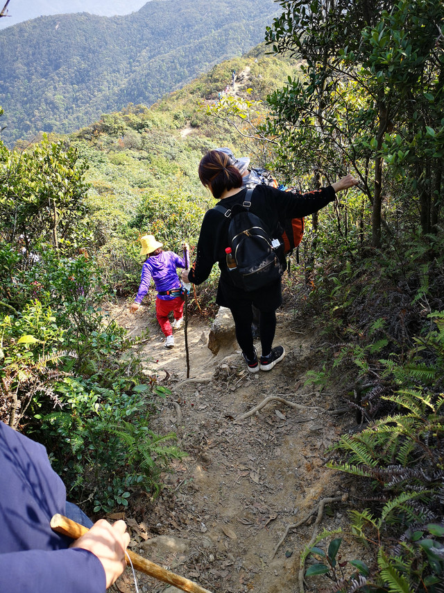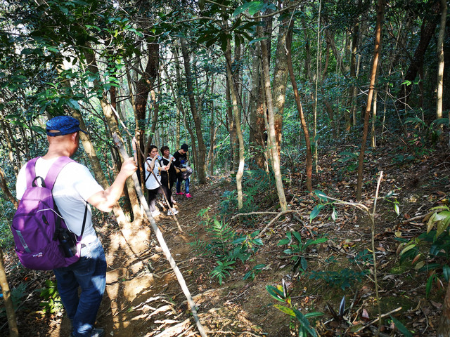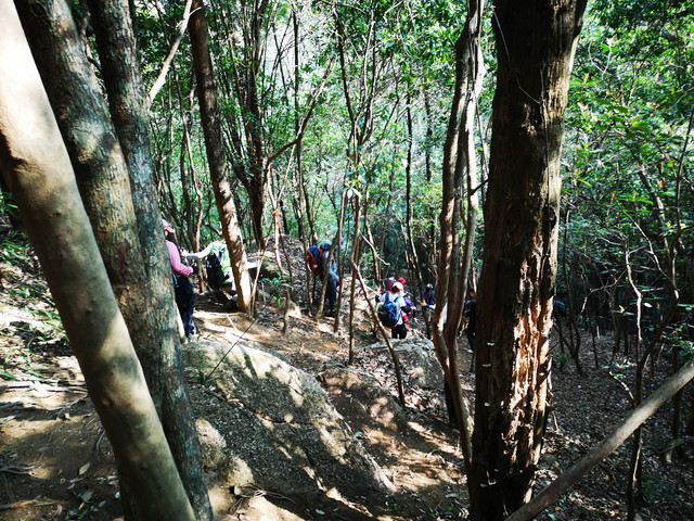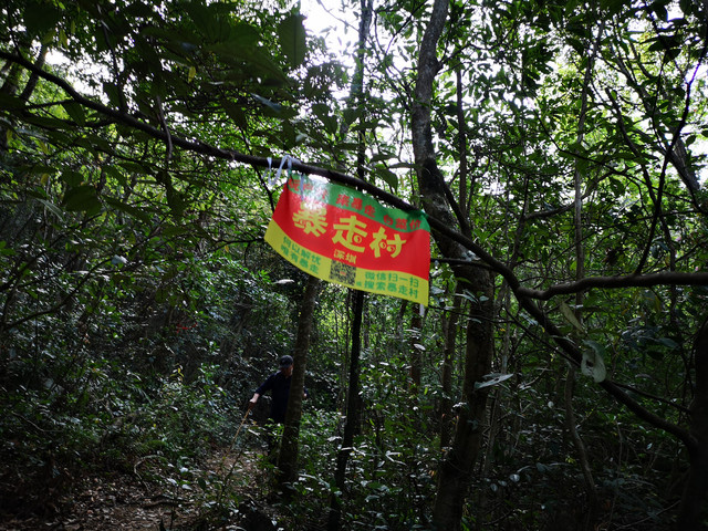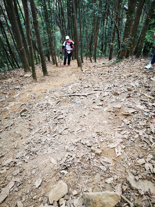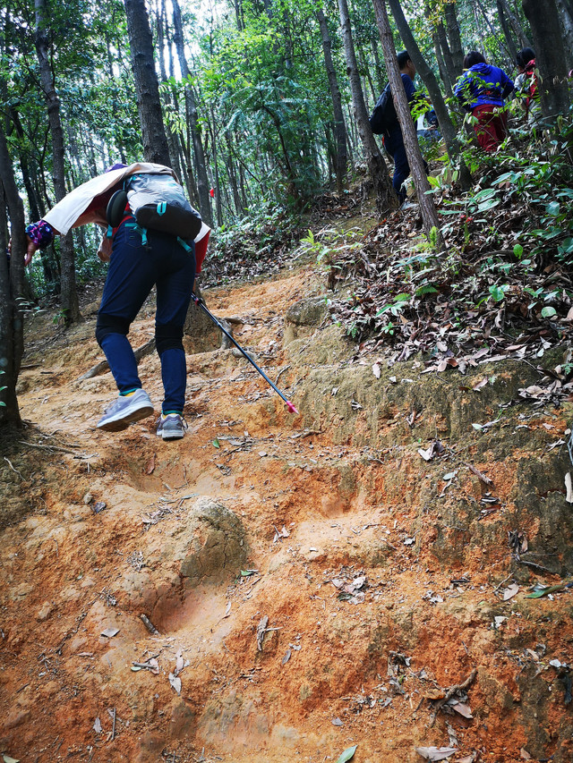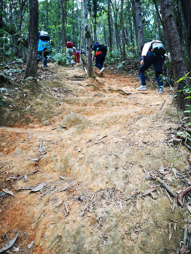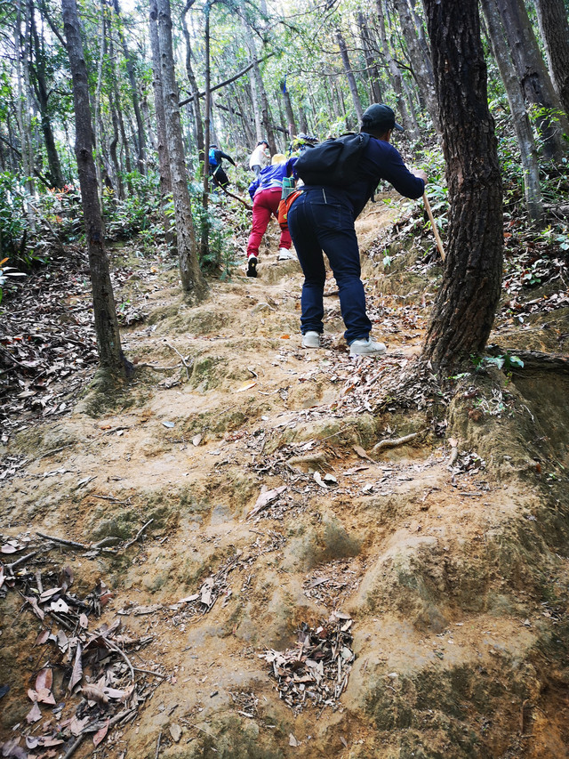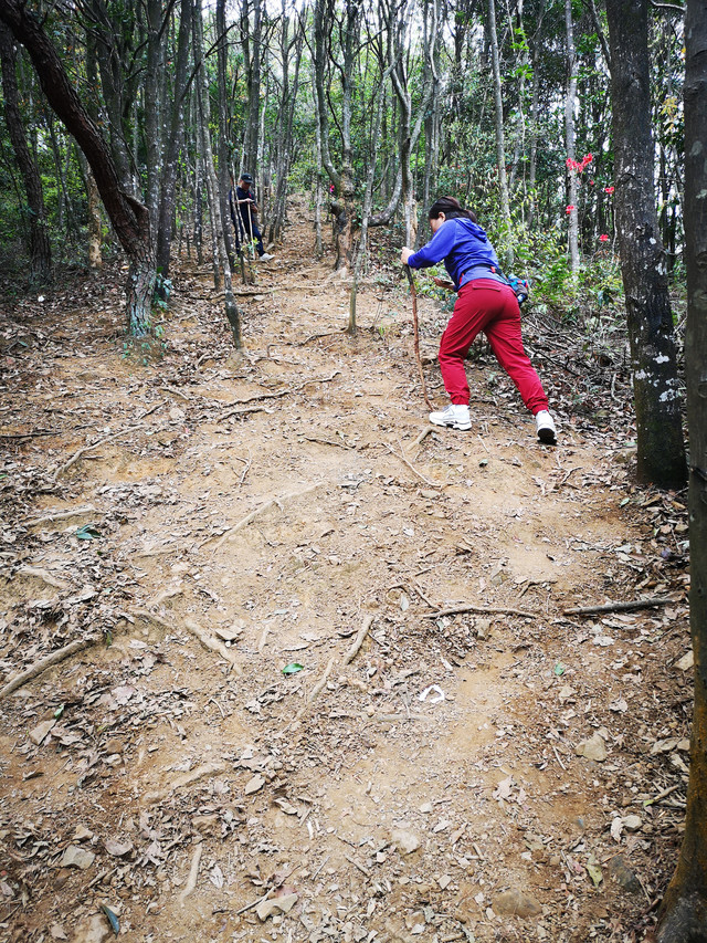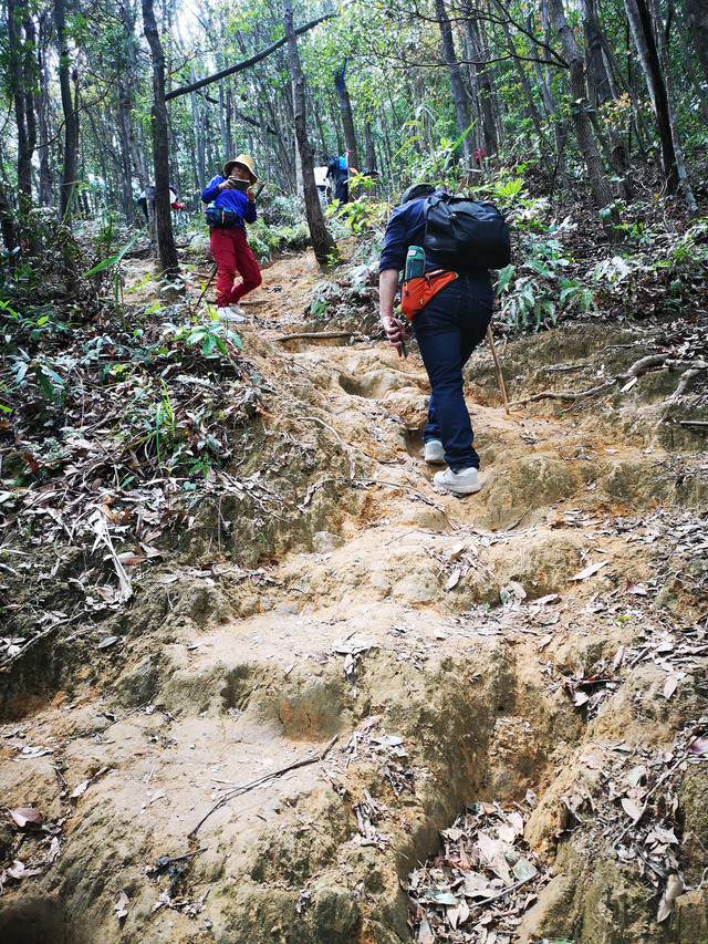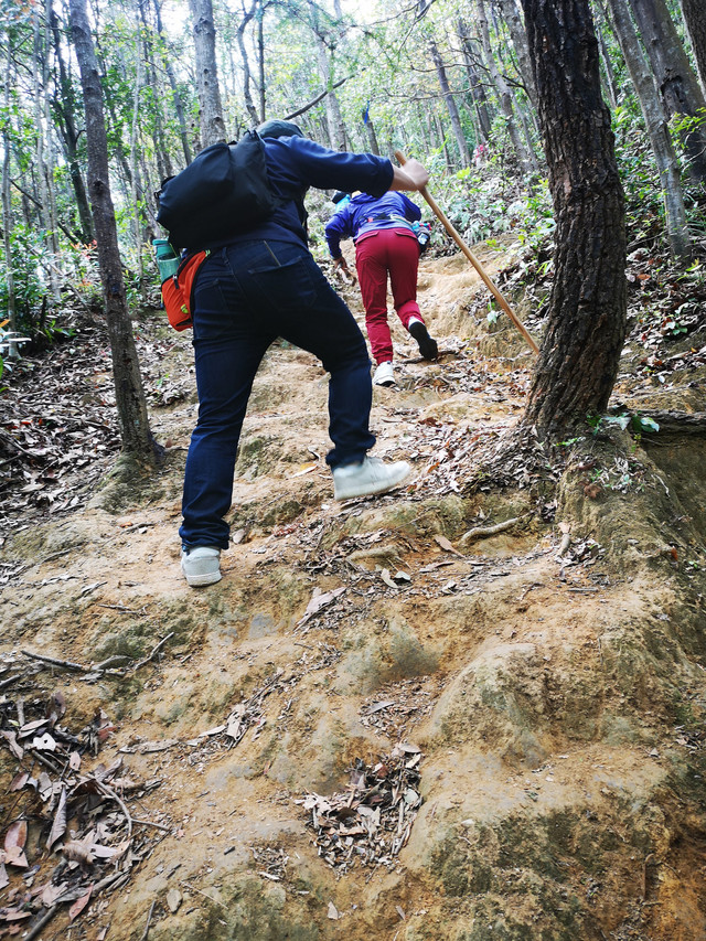 且慢,刚才只是热身而已,现在才刚到山脚呢,从这开始,山路陡峻起来,带了登山拐杖的,赶快拿出来,没带拐杖的,纷纷在路边捡木棍当拐杖。