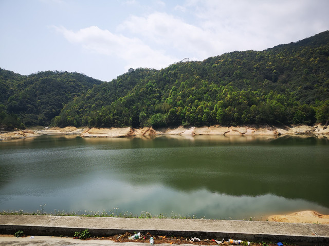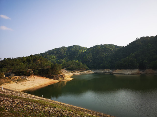沿着这户外团的宣传广告小旗子走,一路顺利下到山脚处,又回到水库这里,12点开始上山,现在下来5点,刚好5个小时,有点累,好在我们的车就停在这里,如果跟团乘坐大巴车,还要徒步4公里到石明小学旁。