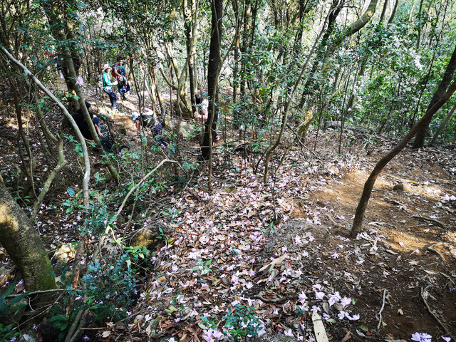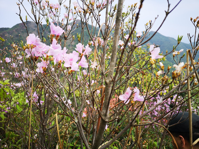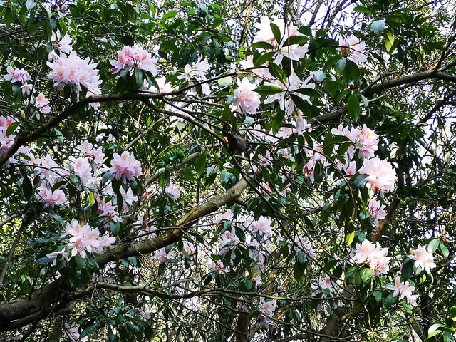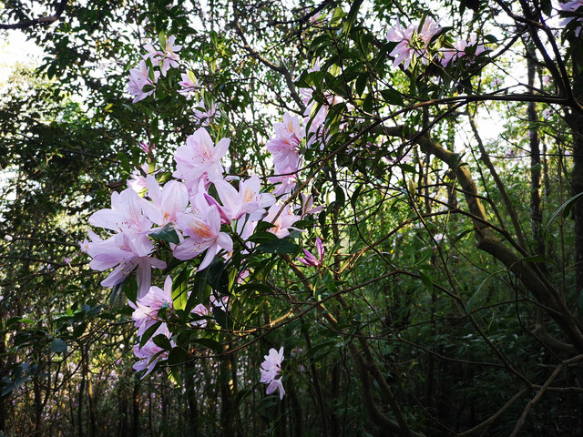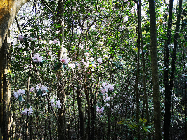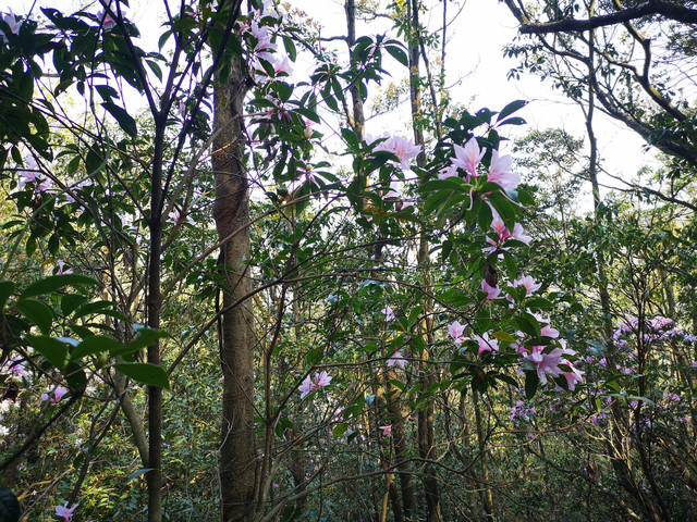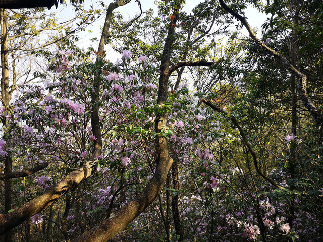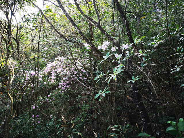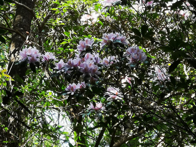 下到半山处,途中有一大片粉红色毛棉杜鹃,树木比较高大,生长在斜坡上。