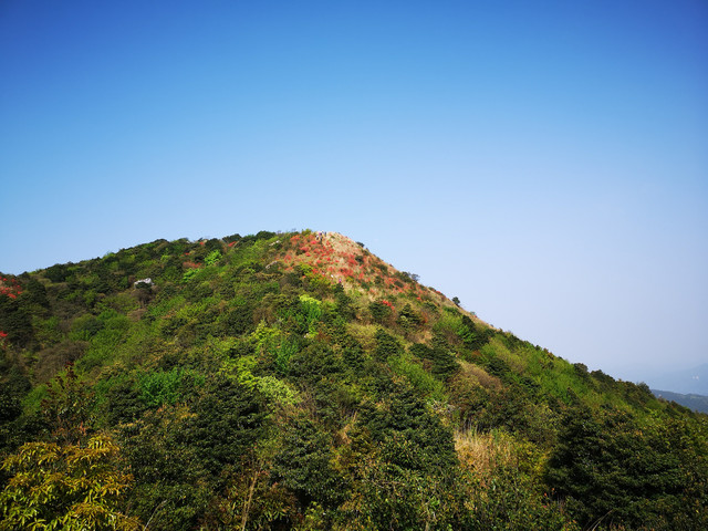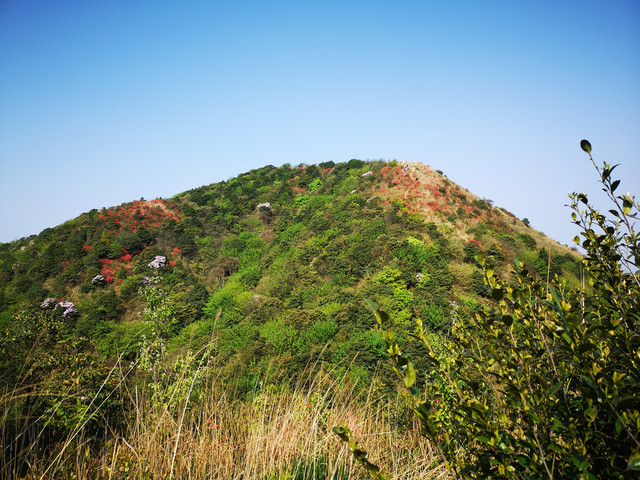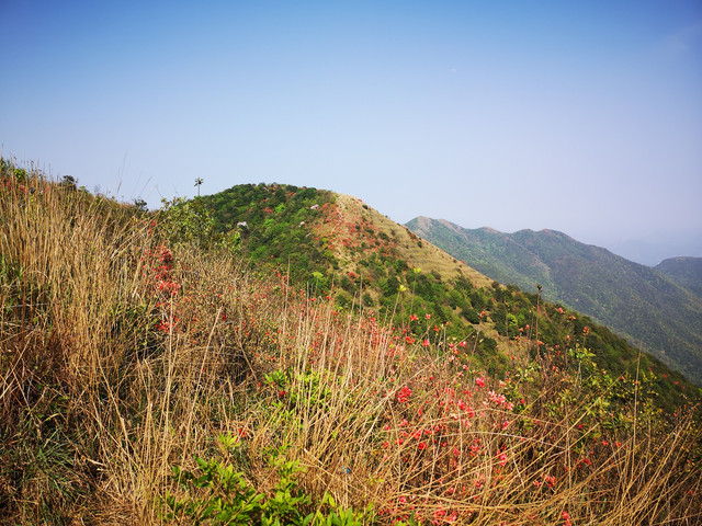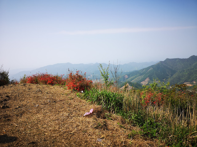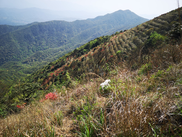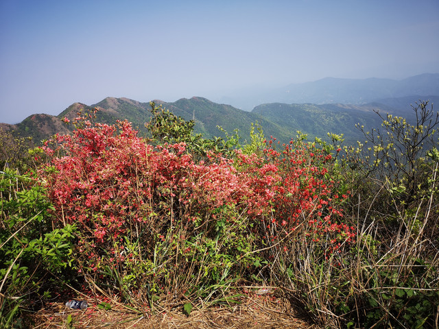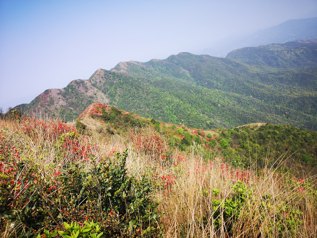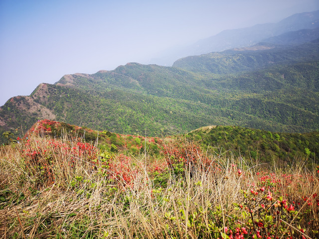 横看成岭侧成峰,山顶处相对比较平坦,也没有高的树木,视野开阔,满山鲜红的杜鹃花和翠绿的植被相辉映