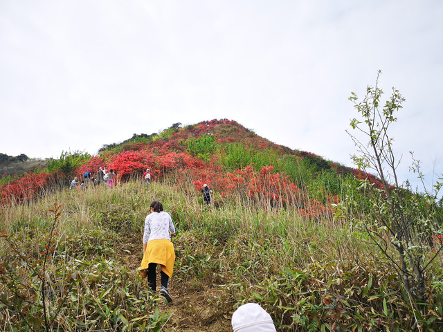 再往前走,大片的花海出现了,抬望去,山顶处,一片鲜艳的红色,果然像红彤彤的蜡烛。