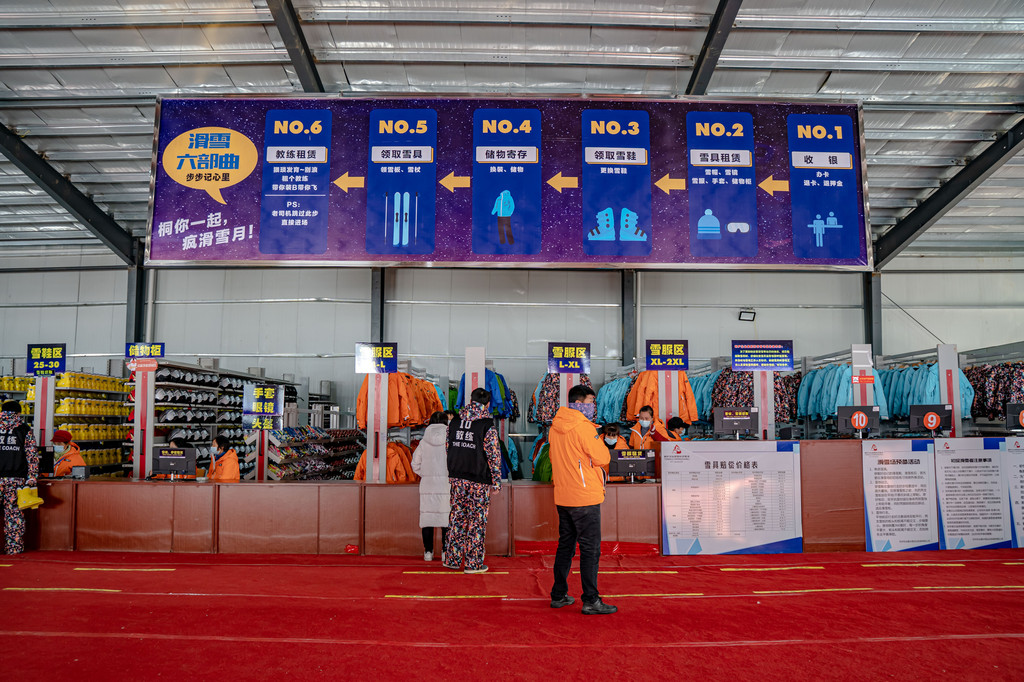 领完这些装备之后,就可以去领取雪板,如果是玩单板的小伙伴还是在领取雪鞋的柜台领取,不过大部分小伙伴都是双板,双板领取处是大厅出门后右手边,每次领取东西都需要刷卡,还设备也是如此,所以卡一定要妥善保存。如果对自己的平衡性不太自信或者是想学滑雪,那么教练是一个不错的选择,请一个教练可以一对一的手把手教你滑雪。