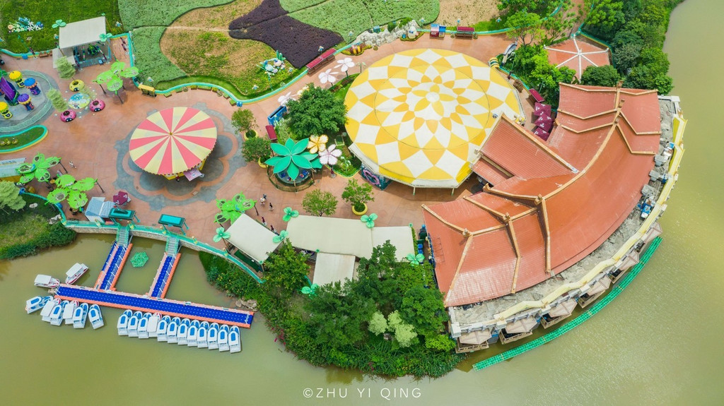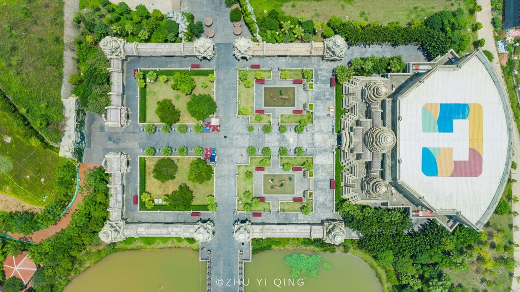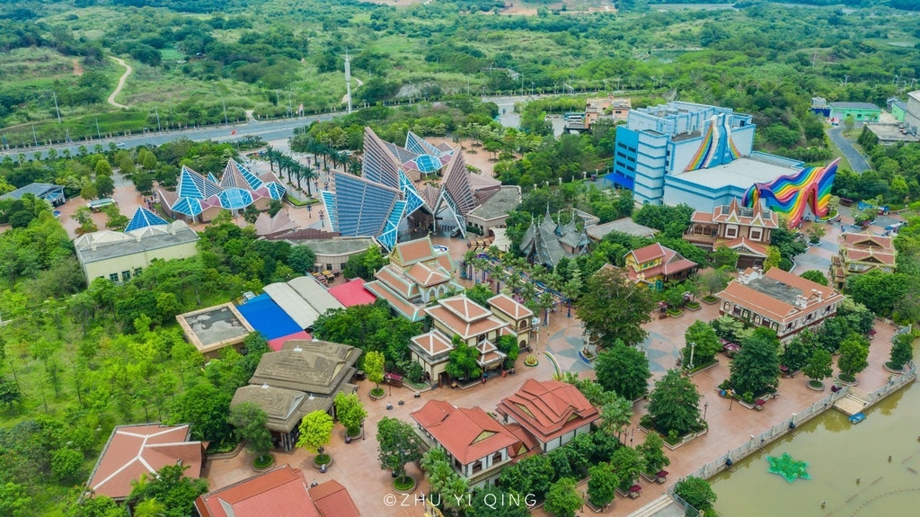 方特东盟神画的地理位置特别好,背倚青秀山,沿邕江而建,景色非常秀丽,从高空往下看,方特东盟神画处于一片绿水丛林中,各式各样的东南亚建筑装点在其中,非常漂亮。而南宁也不愧是中国最干净的绿色城市之一,城市里全是绿植。