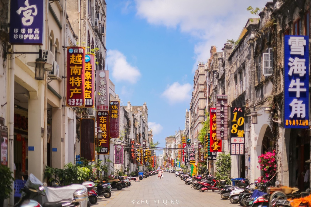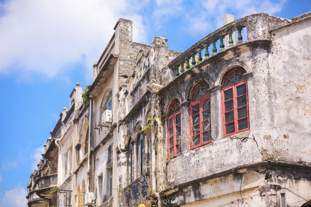 19世纪英法等国家在这里建起属于他们的建筑,所以如今老街的骑楼就是受西方国家的影响。窗柱工艺精美,线条感流畅,就连街道墙面上的装修样式都各不相同,有浮雕雕刻而成的长廊,即使有岁月的痕迹,依旧别具一格。人们走在骑楼下逛着街,如果太阳太大或是下雨,可以在骑楼下遮阳避雨,这就是骑楼建筑最特殊的功能。
