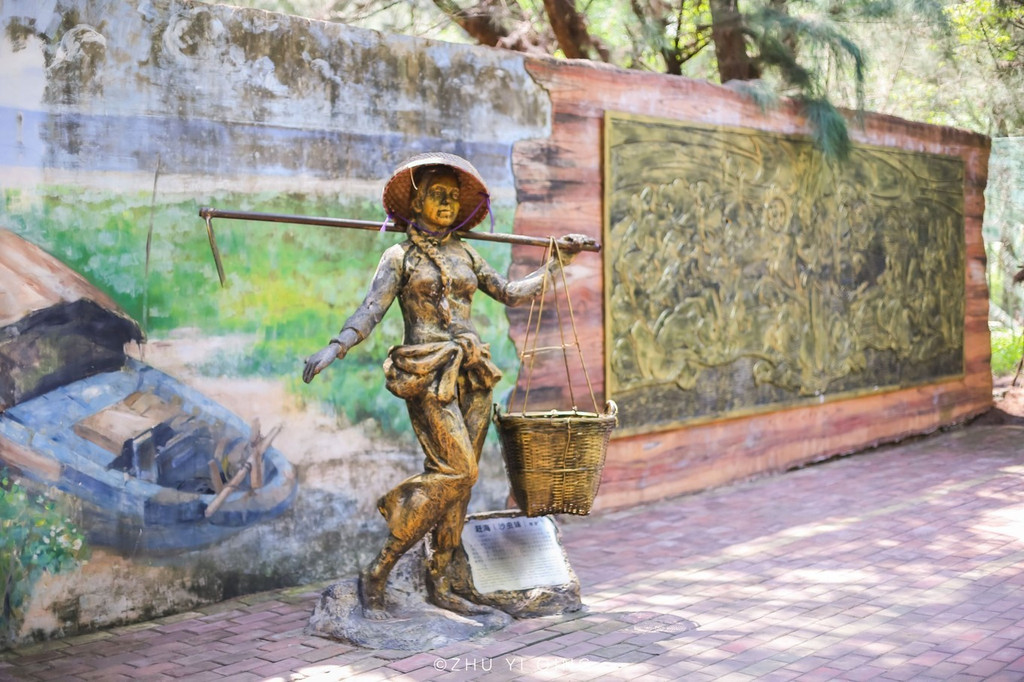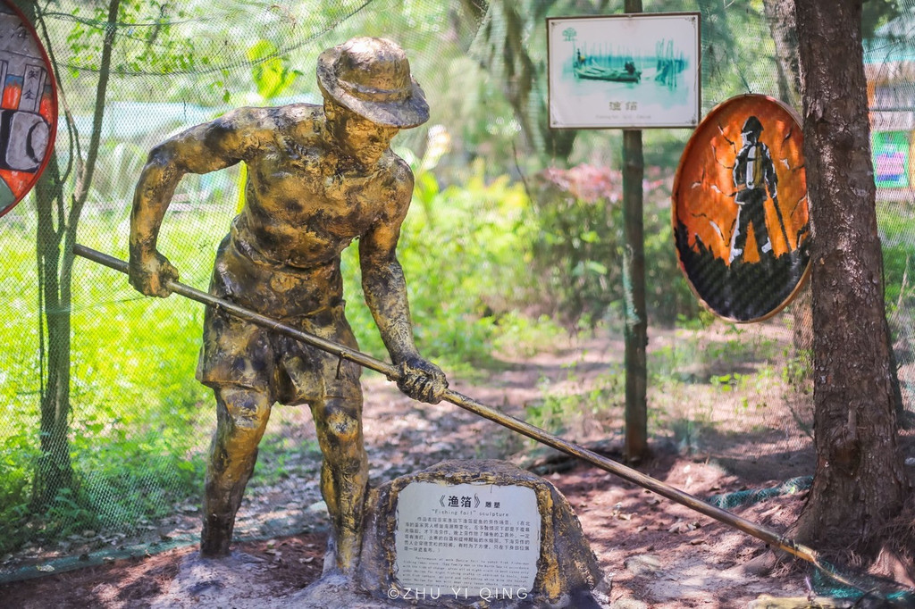 疍家民俗园里呈现给我们的是他们悠久的历史文化和民风民俗,大海是他们世世代代生活的地方,在海岸边形成了他们独有的文化。我在这里看到他们各种各样的捕鱼器具,用雕塑的形式生动形象地表现出来,捕鱼的器具也会在石头上有简单的介绍,让我们更好地去认识他们的生活。