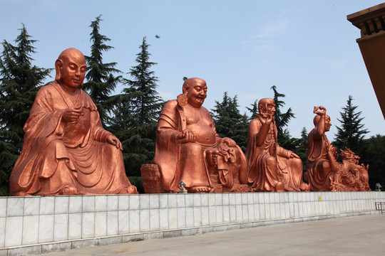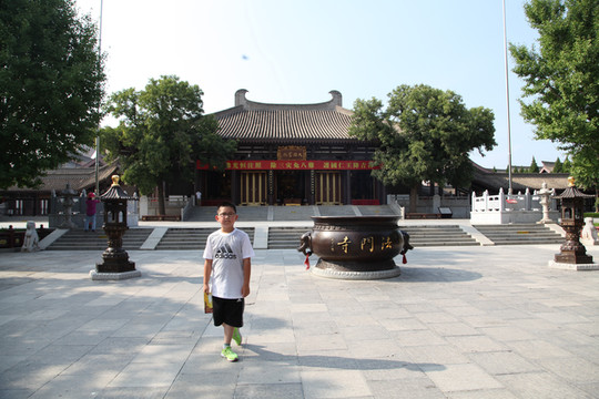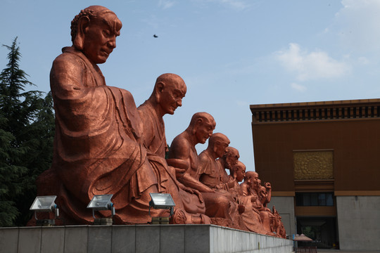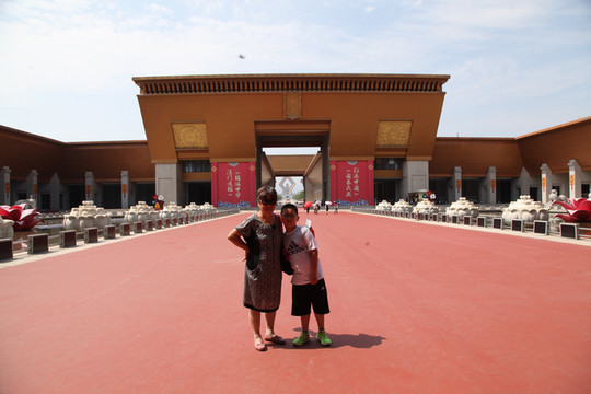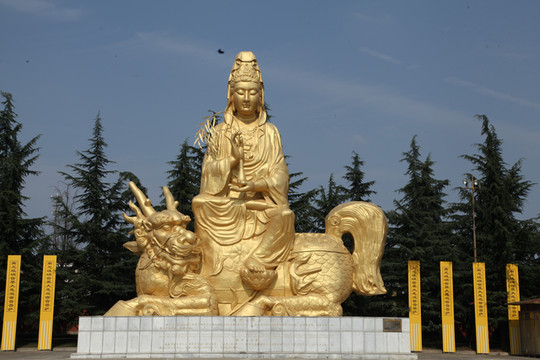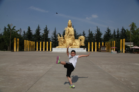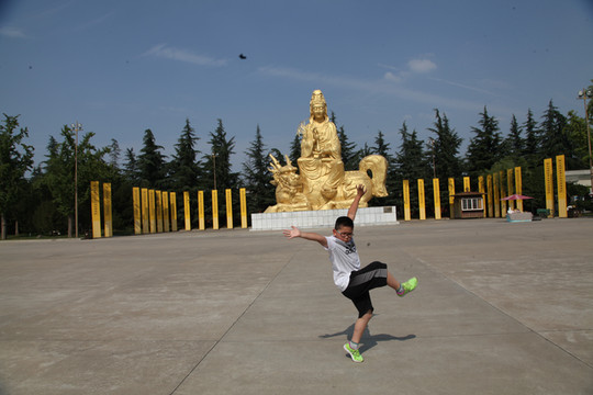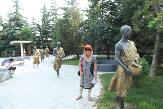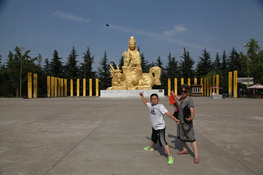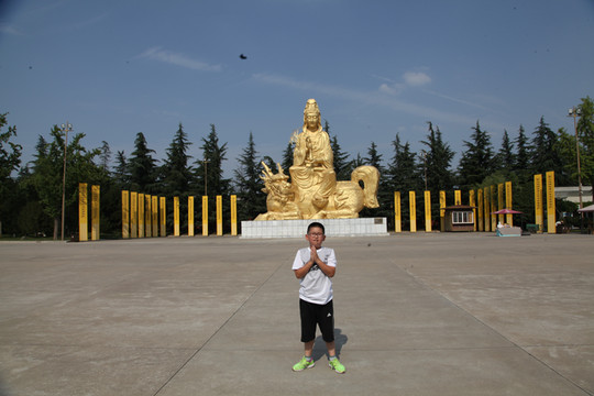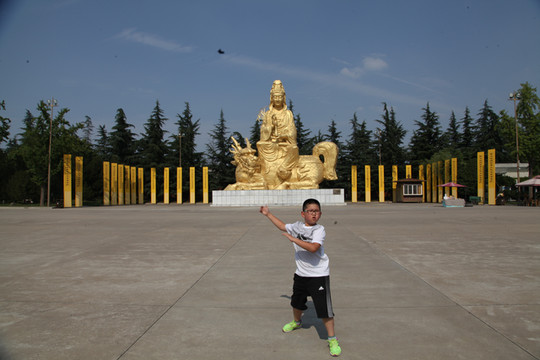 天气炙热,烧烤着大地,足有38度,外婆身体不适走得很慢,我们慢悠悠地朝前走。旷阔的广场上,树立着一座座相对而坐高大的菩萨像,有文殊、普贤、观音和大势至菩萨等,直到快要16:30PM时,我们还没走到法门寺正门口, 猛然发现景区快要关门了。