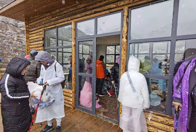 因为计划明天就要返程,所以一天要转完,无奈长线和短线只能二选一。难得来一次,果断选择了长线(冲古寺-洛绒牛场-牛奶海-五色海)。早上早早起来,带好提前准备好的雨衣(雨衣建议一定要买那种磨砂厚一点的,不要买那种塑料薄薄的,风一吹全跑了)、雨鞋套(如果不是小白鞋可以不用)、氧气瓶(这个看个人情况,我们基本没用上)和士力架(网上的攻略大多推荐这个),外加一杯热水(个人感觉雨衣、士力架和热水是必备)。考虑到后面洛绒牛场到牛奶海再到后面的五色海这段只能徒步,单程5.5km,还是登山路,所以前面能坐景区车的都选择了坐车。景区开放时间段的入口处人还是一如既往的多(想想头天关门后,来是多么明智的事^^)。
