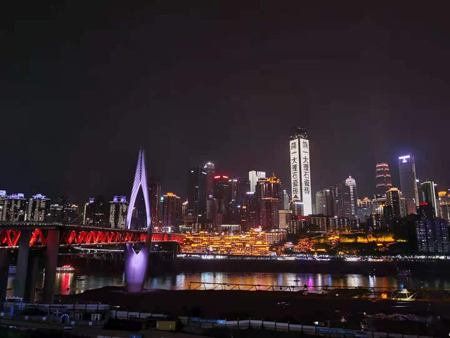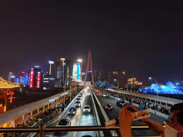 等到20点多,终于可以去看洪崖洞的夜景了(网上攻略说最好的夜景时间段就是20-21点)。此时洪崖洞果然如预期所料,周边一圈在地图上的实时路况显示已经红的发污了,景区入口也排了长龙般的队伍。好在提前做了攻略,直接去旁边的千厮门桥上观看最完整的夜景,桥上的人也不比下面人少,不过桥上为了控制人流(不知平时是否也这样),两边人行道是双向单行,最尴尬的就是靠近洪崖洞这半边是回程的一边,也就是说需要先走到桥的对岸,再往回走才行。当然,为了节约体力走后面的路,我们选择坐一站地铁到对岸的大剧院站,然后往回走,机智^^
