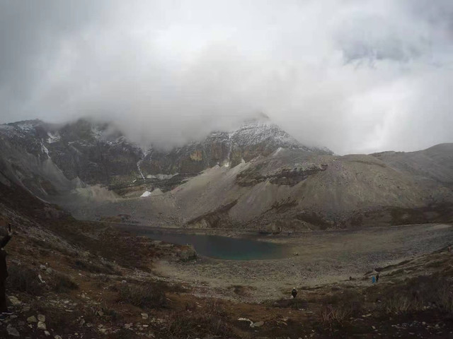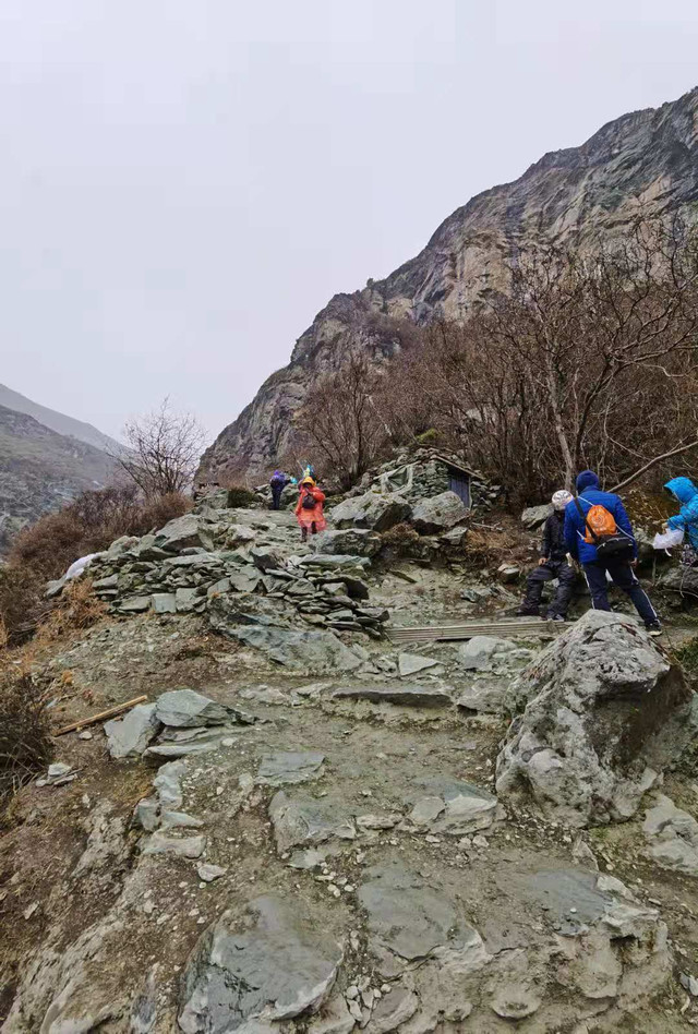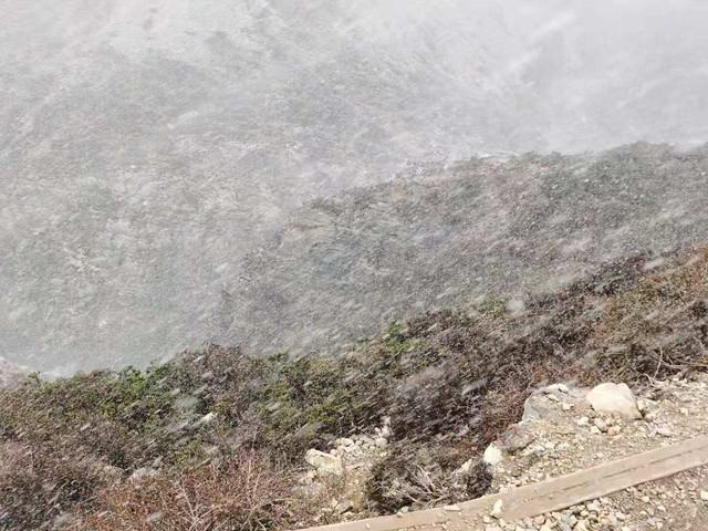 从下面这里开始,马也不能坐了,开始爬山,今天天气属于云雾缭绕,还下了不小的冰雹,再加上山顶的大风,这时凸显出厚雨衣的重要性了