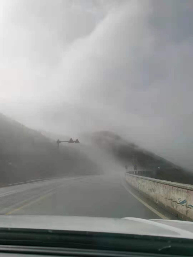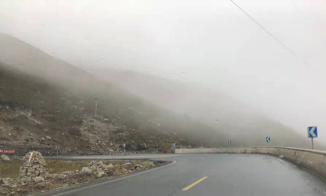 穿过 康定 ,第一个要过的就是有名的折多山,折多山气候多变,经常会遇到雨雾天,我们和上次一样,到这里的时候已是雨雾缭绕了,温度也从 重庆 的32度直降到了3度,山路依旧弯弯折折,海拔也随之急速上升,折多山的最高海拔将近4800-4900米,大家也可以在这里先行过渡适应下(我们到这里还来不及换冬装^^)