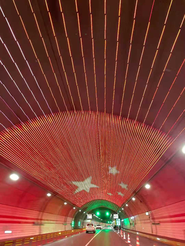 之后要穿很长的隧道群,长的一个10km,短的一个2km,隧道的灯带很新颖。刚过 新都桥 的隧道还好,限速60km/h,可是再往后不知道为什么就变成了限速30km/h,而且还是区间测速,简直像爬行一样,后面的本地车总是宁可压线变道也要超过我们,我们只能老老实实按着规定来。