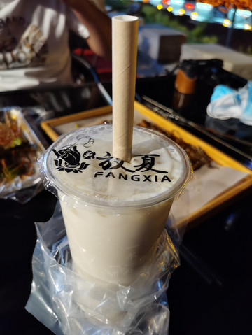 晚上逛了会夜市,在党河边吃了顿烧烤,还在烧烤摊点了杯放夏的甜醅子奶茶,我宣布,这是我这次旅行喝到的最好喝的奶茶哈哈,所以我第二天晚上逛夜市的时候又在店里喝了一杯,超赞。