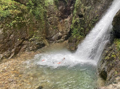 看到了飞龙瀑布。因为刚刚下过雨的缘故,这里的水流还是很壮观的。瀑布的水流下来,竟然看到了好几条小鱼。