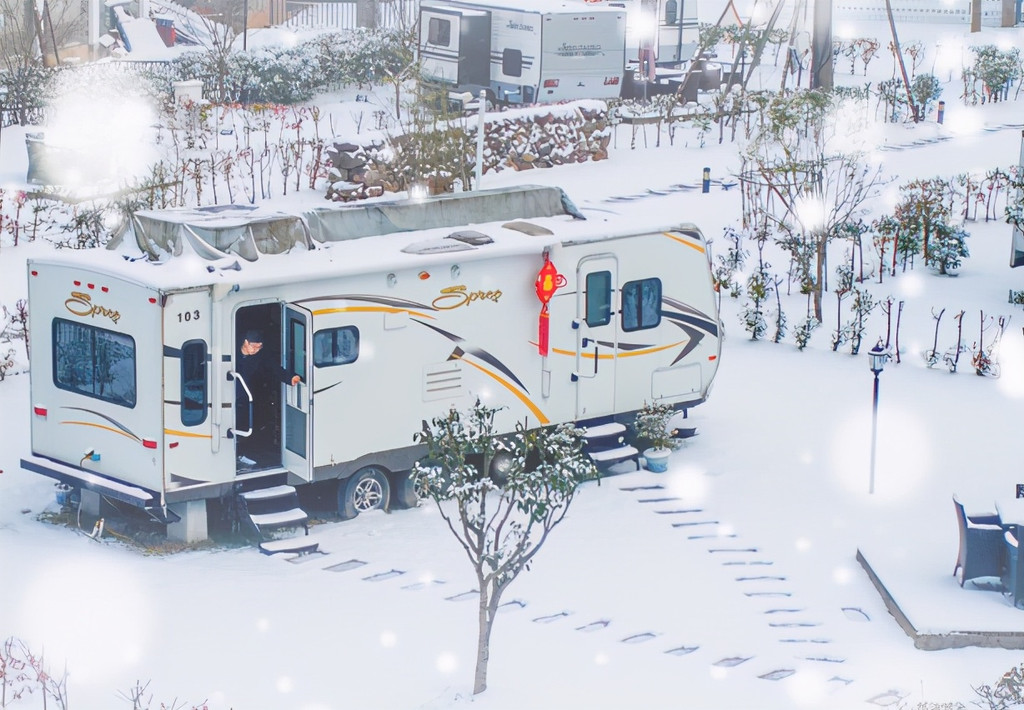 夜晚居住房车里,小而温馨一个家的感觉,如果下雪了,屋内暖和,屋外大雪。