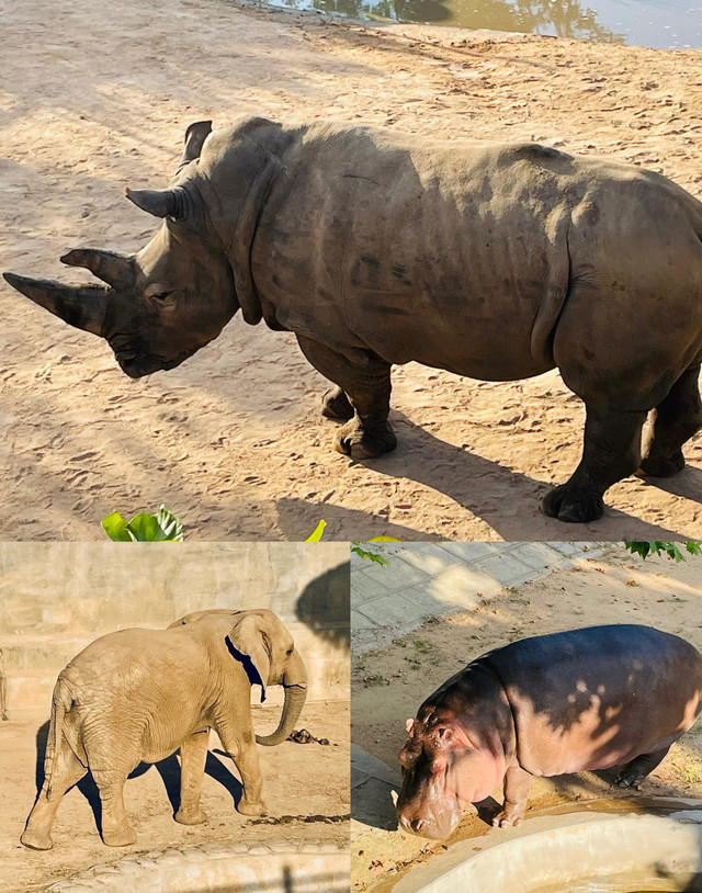 很快来到另一特色-非洲区,大象,河马,犀牛和长颈鹿。大象踱着步,是不是用鼻子敲着门,是乎提醒饲养员该喂饭了;而河马在水里游弋着,两个小耳朵不停的摆动着;