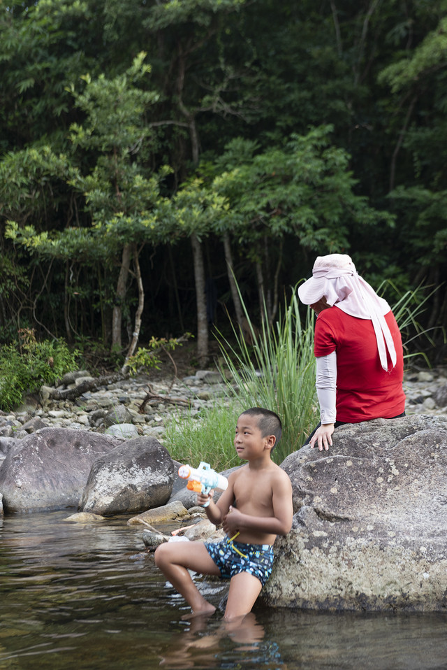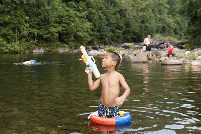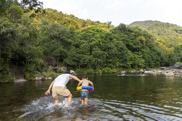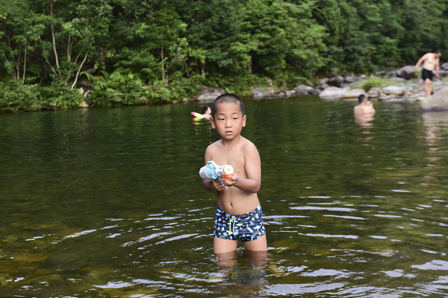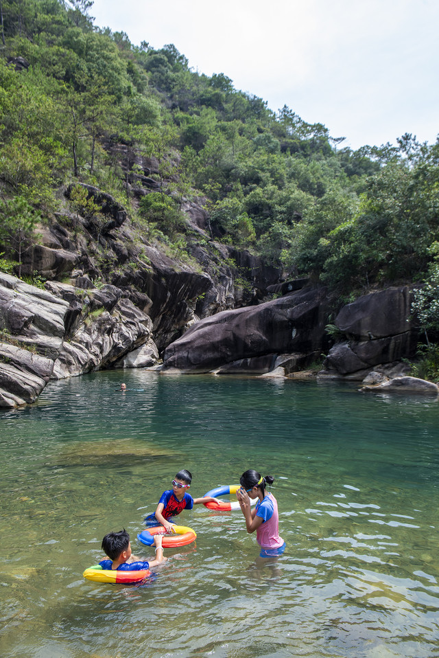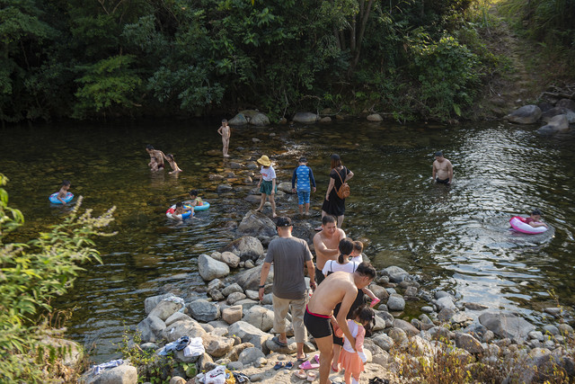 一群小孩子早已在大人的带领下抢了先机,套着泳圈在溪水里摸鱼、玩水,不亦乐乎。