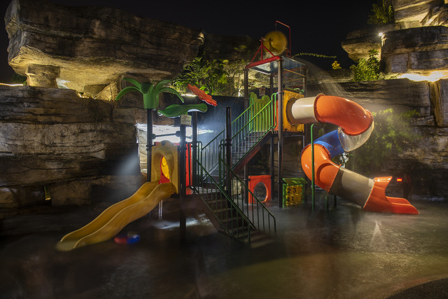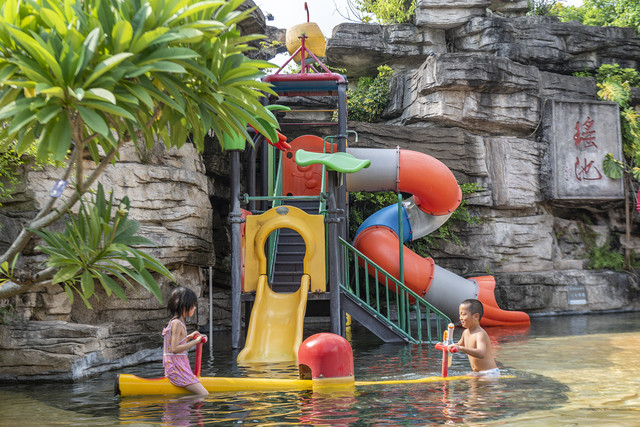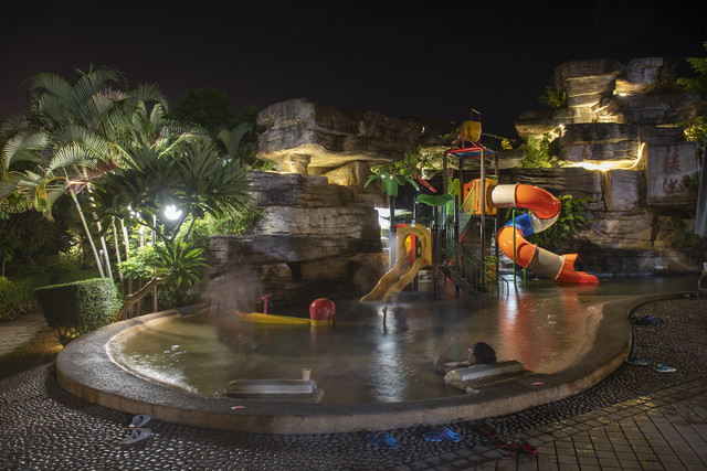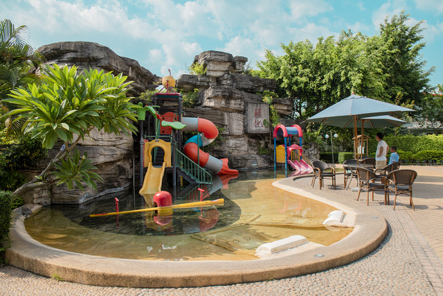 小孩子们尤爱瑶池,因为有水上滑梯、水上跷跷板和水上躺椅,此时此刻,大人们便悠闲地在躺椅上躺着,感觉温泉水滋润身体的舒适,孩子们则尽情地玩耍,而且温泉水是适合孩子体感的温度,泡起来别提有多舒服了。