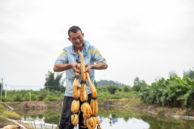 还跟他爸一起配合,两人一起摘了豆角、黄瓜和桑叶,满满的收获。
