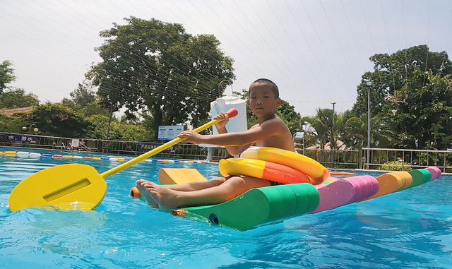 度假村的泳池也很适合亲子,有浅水区和深水区,还配备了很多儿童泳圈以及救生员,娃除了在泳池里戏水,还在水上划起了“水排”,像模象样玩起了“划船”。