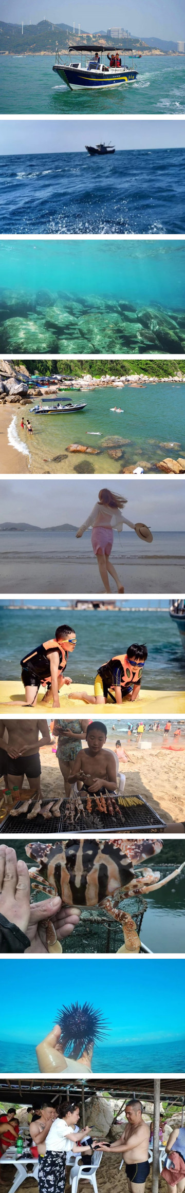 玩乐项目:海上观光、前往外海登岛拍照玩乐、浮潜游玩、海钓等;近海渔家乐撒网捕鱼、收蟹笼抓螃蟹、划船、水上浮毯娱乐、游泳或浮潜、户外沙滩海鲜粥+自助烧烤或美味海鲜餐