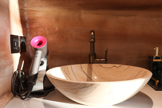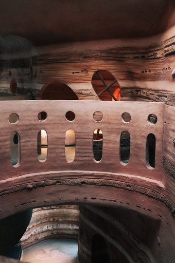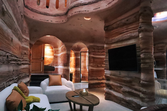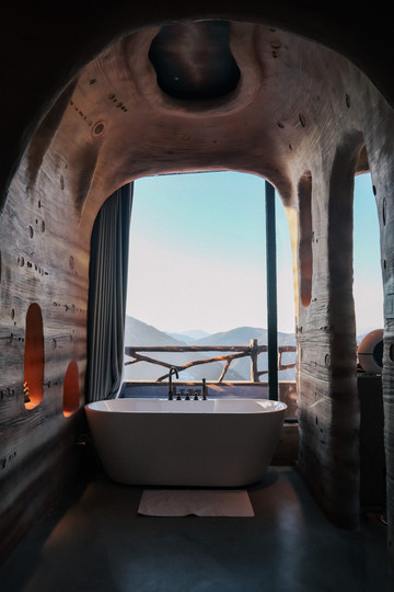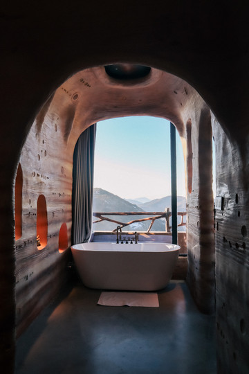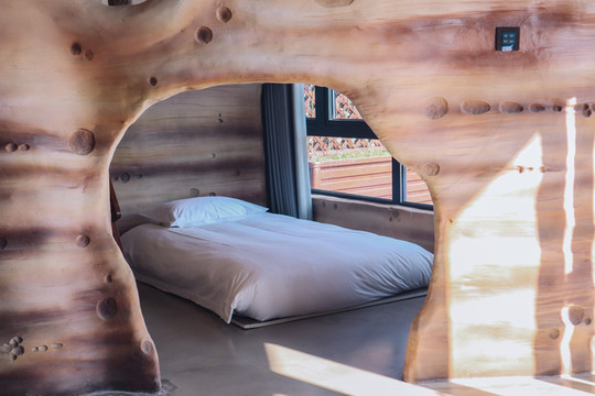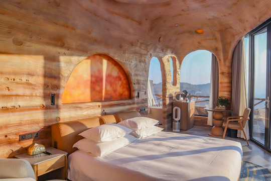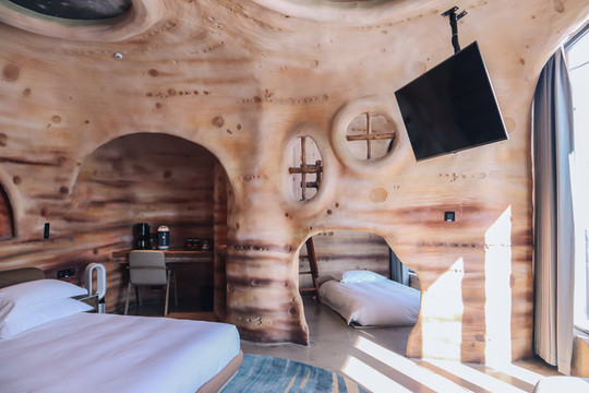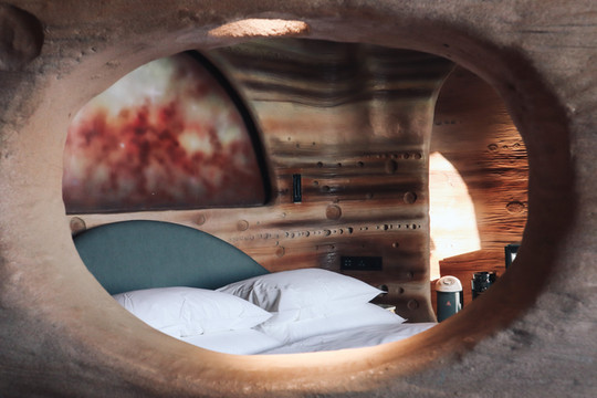 客房内部更是非同一般,外星球质感的洞穴式主题客房深深引起了我的兴趣,每个客房既有相似之处,又有不同之处。有的客房推开窗便是滑雪场,视野非常开阔,下午时分,暖暖的阳光洒进来,整个客房都是冬日暖阳的味道。