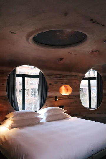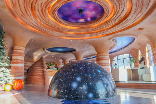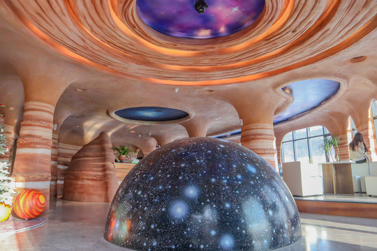 酒店内部以太阳系八大星系为主题,在一楼大厅即可看到一个很大的半圆形星球,屋顶便设计成了一个宇宙的形状,感觉自己好像进入了浩瀚无垠的宇宙中,一切都非常梦幻。