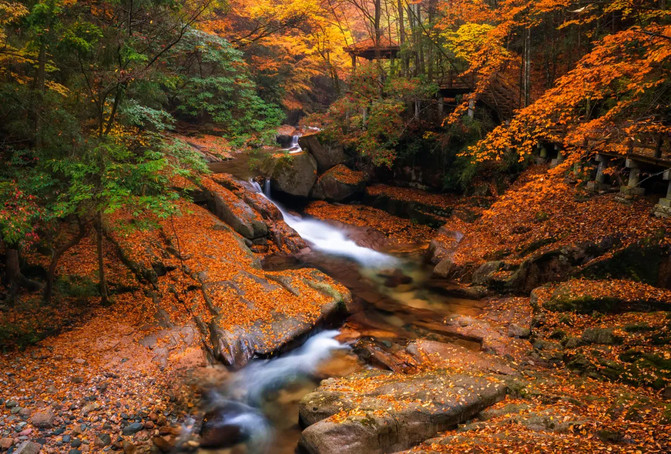 溪水从山顶潺潺流下,溪边是斑斓的彩叶,红的、黄的、橙的...美不胜收。