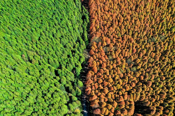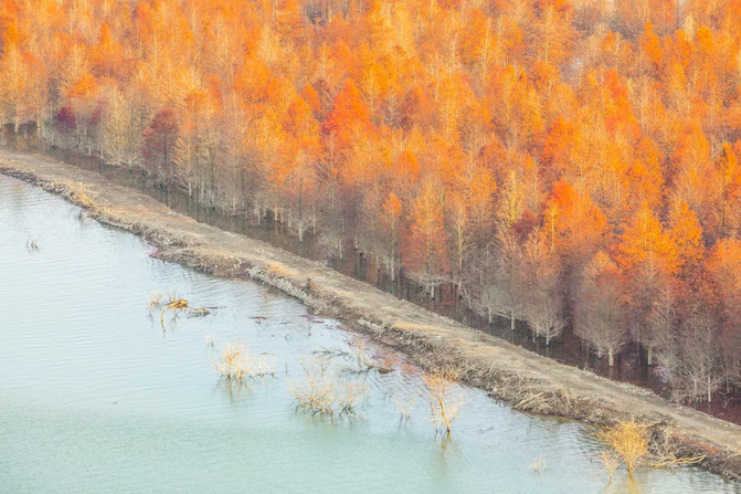 万亩水杉沿着浅浅的湾流排列,与清澈的水面相互映衬,组成一幅美丽的画卷。